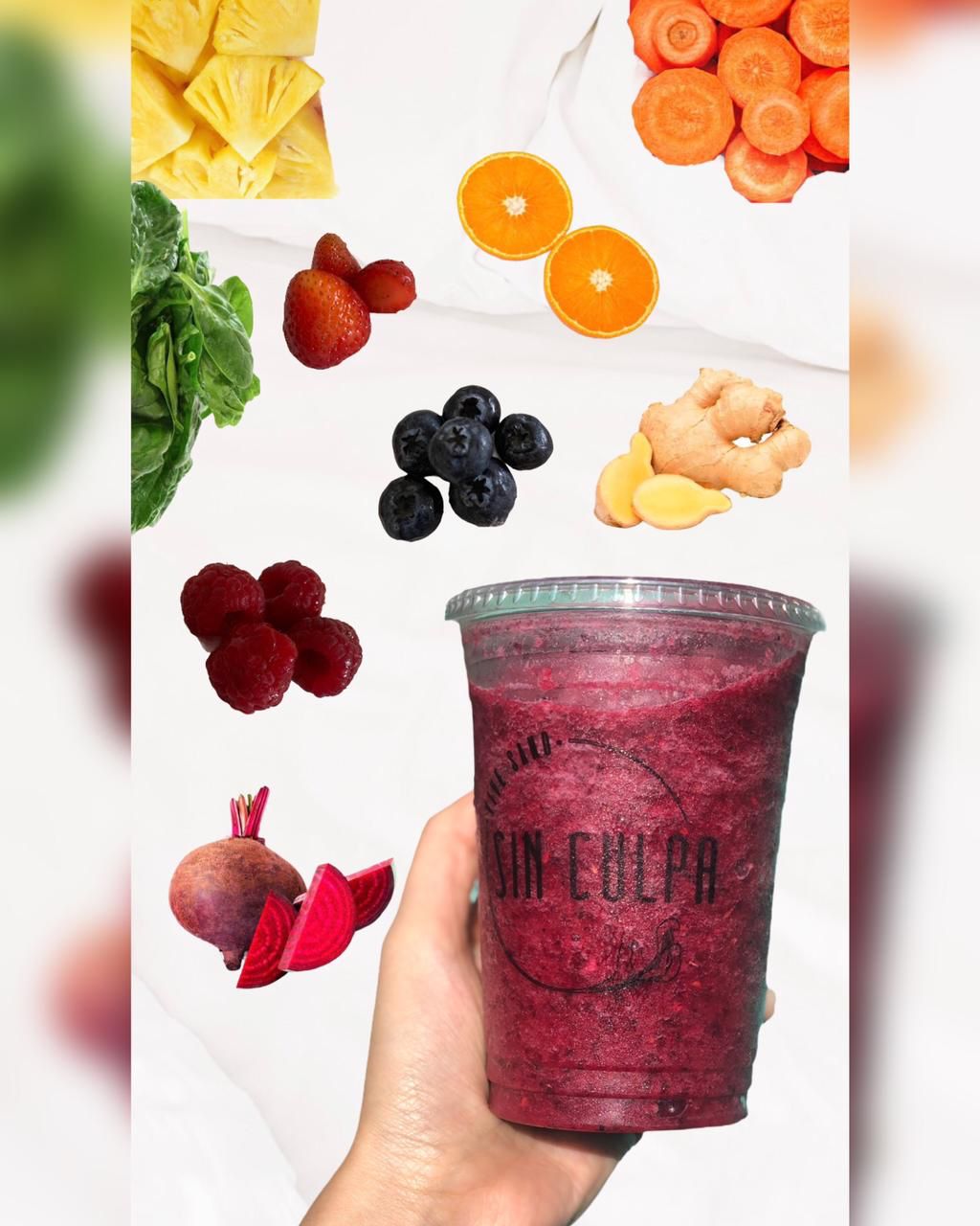 Betabel, jengibre, piña, naranja, frutos rojos, espinaca y zanahoria.