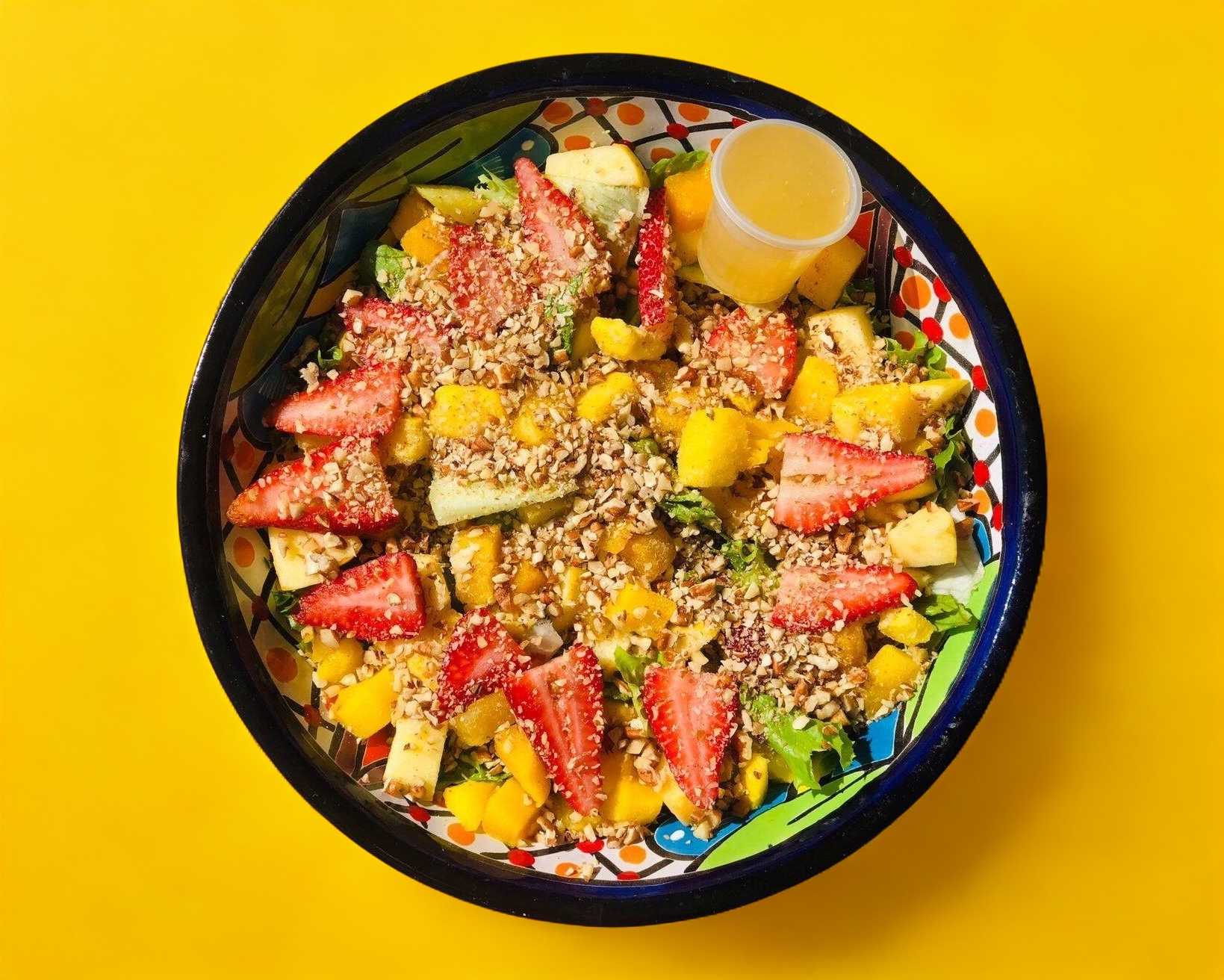 Mezcla de lechuga fresca, espinaca, uva, fresa y agregamos un poco de quinoa cocida. Con un topping de arandano deshidratado y semilla de girasol garapiñada