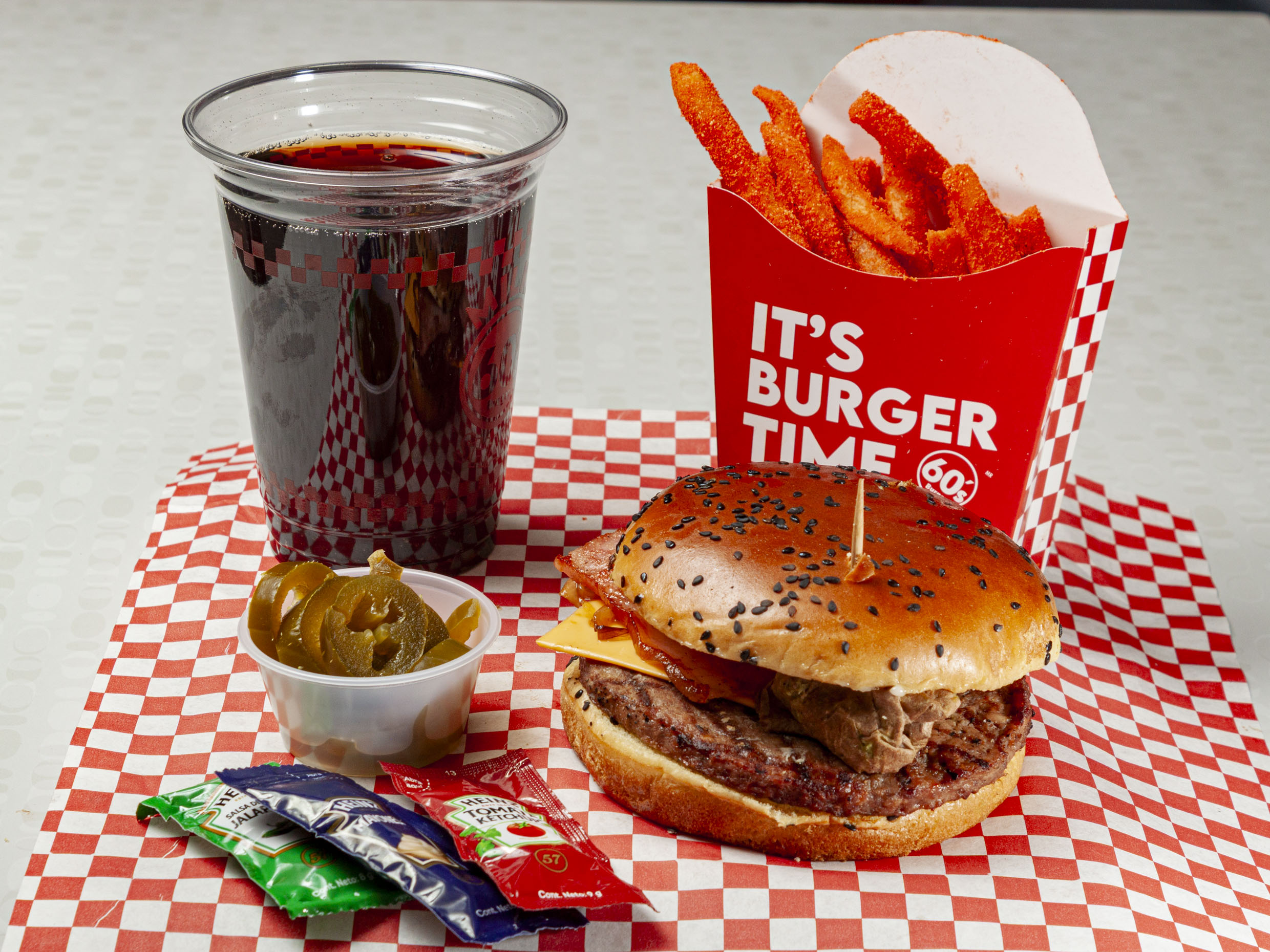 Hamburguesa bacon BBQ doble, papas a la francesa medianas y refresco de 355 ml a elección.