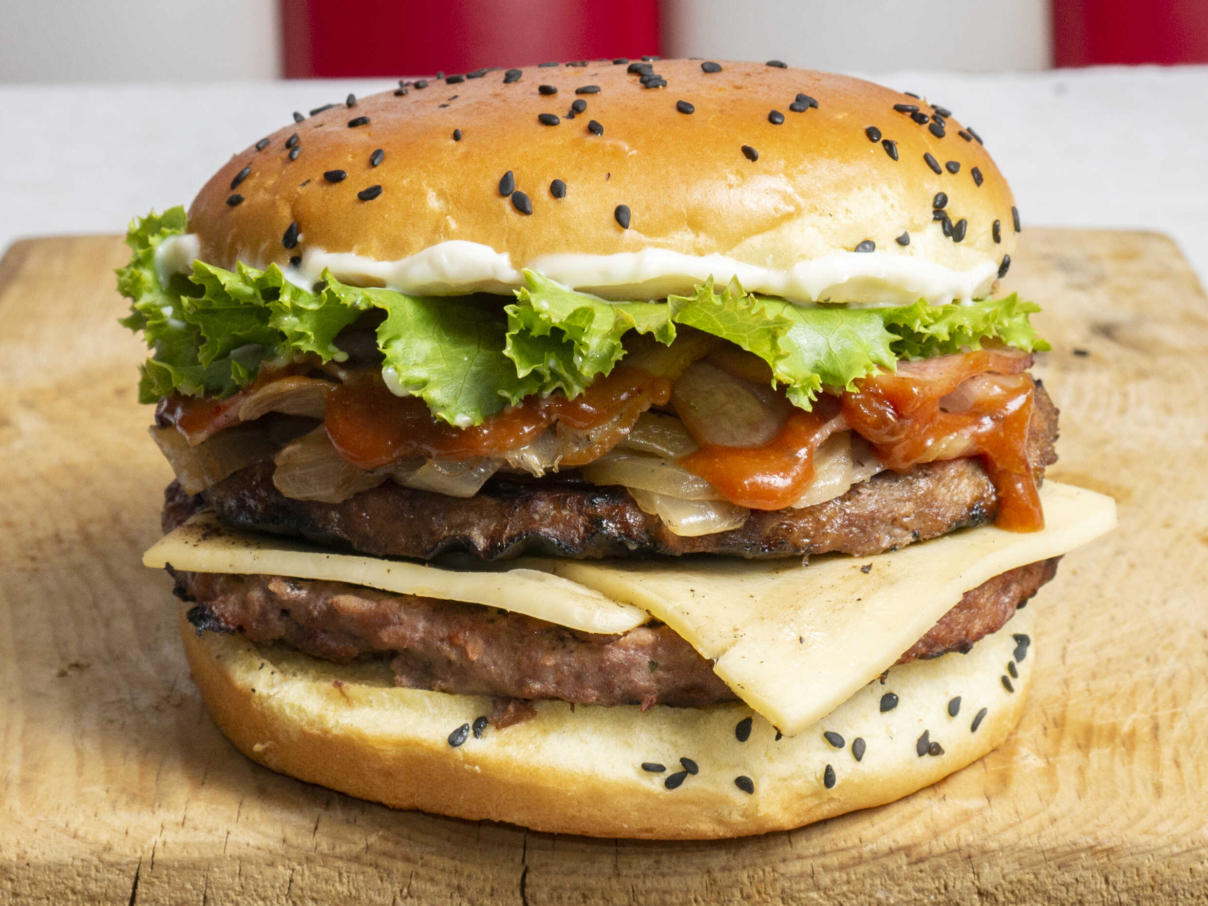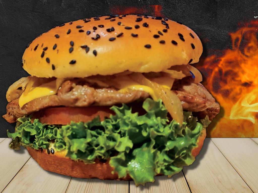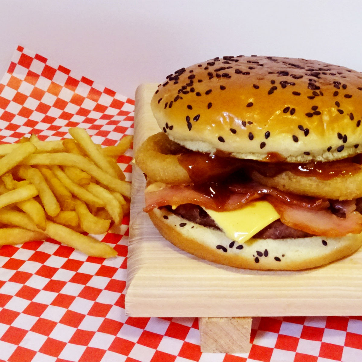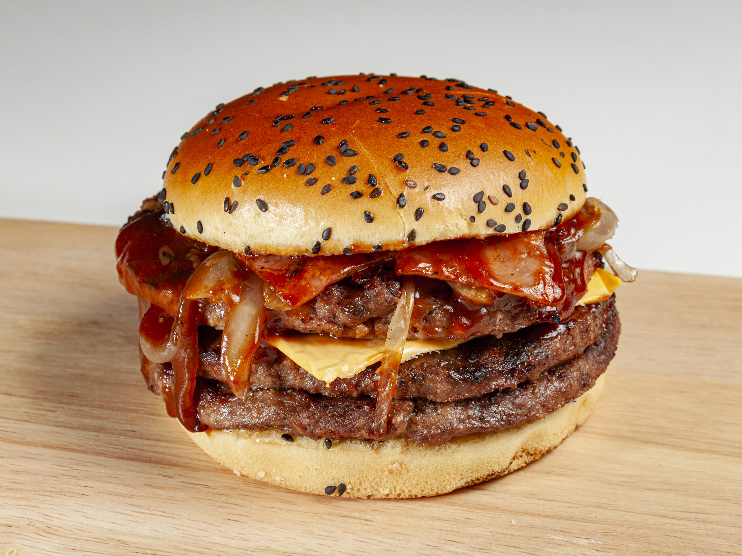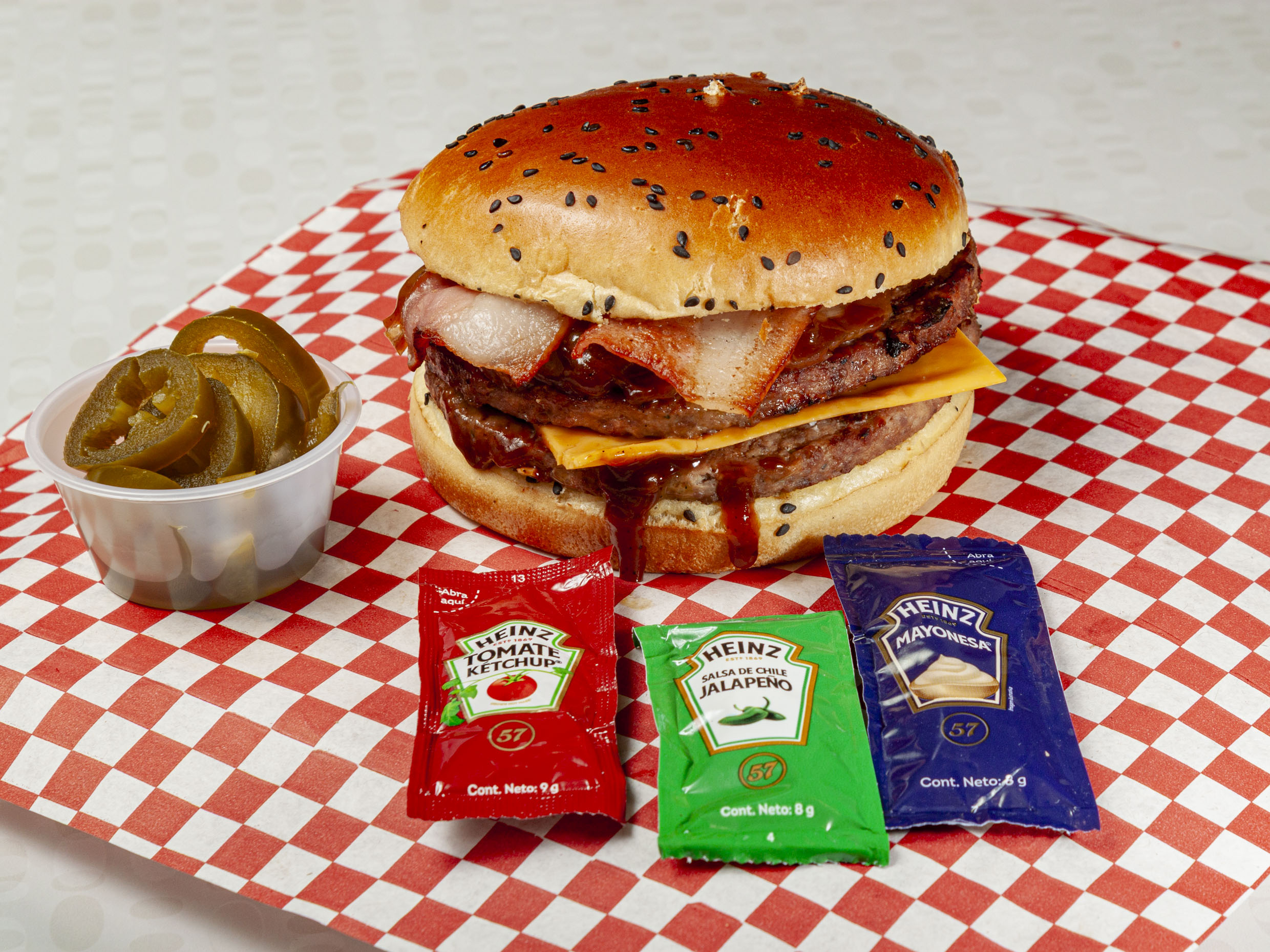 Hamburguesa doble con queso americano, tocino, cebolla caramelizada y salsa BBQ.
