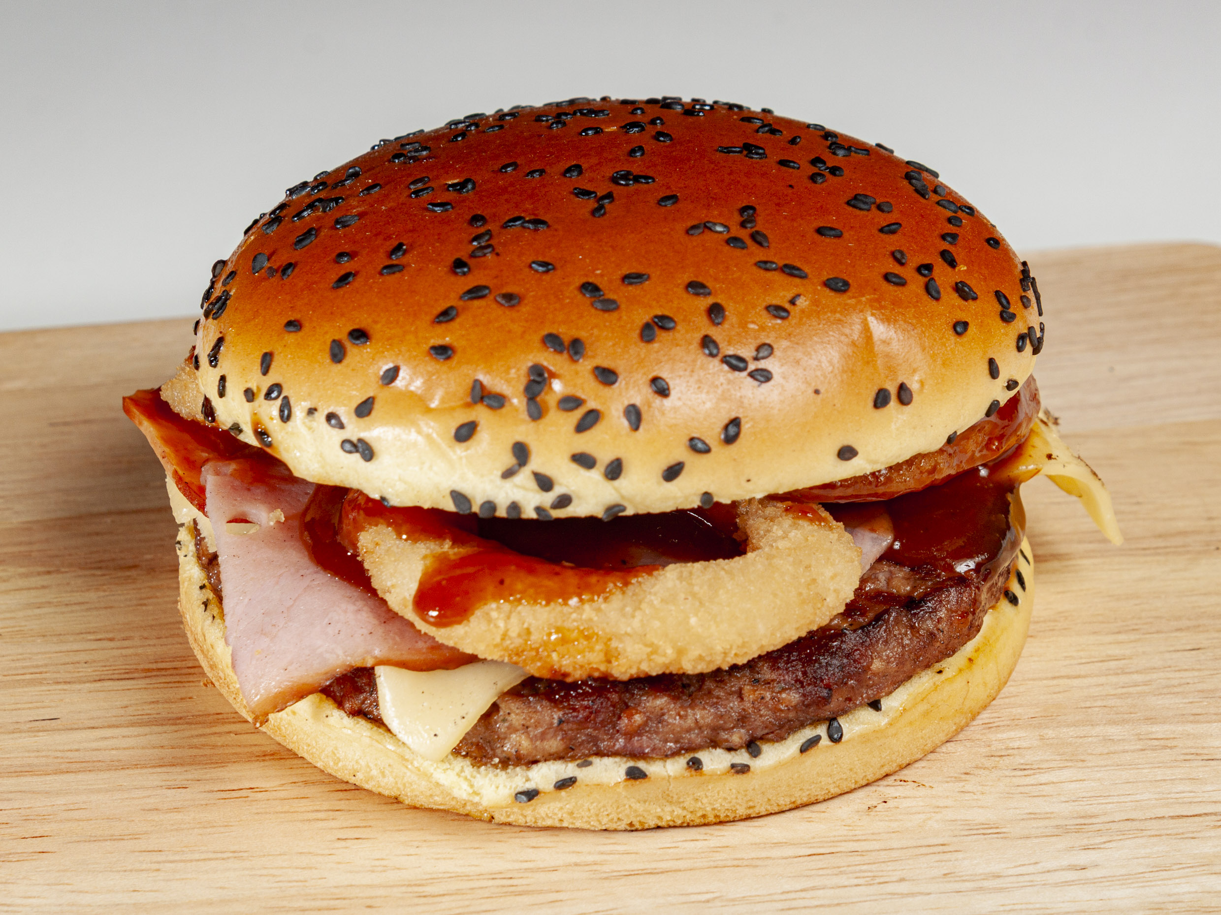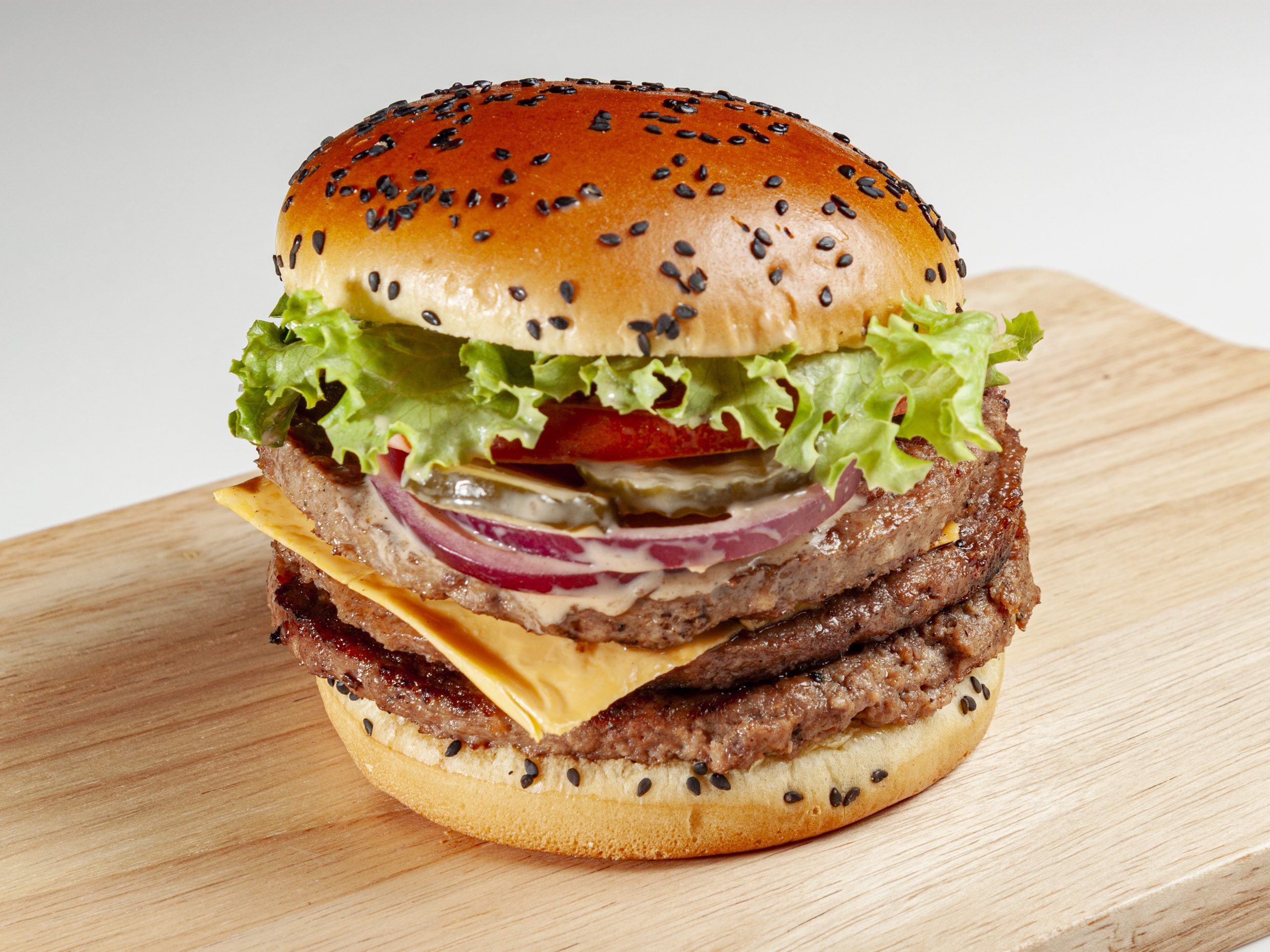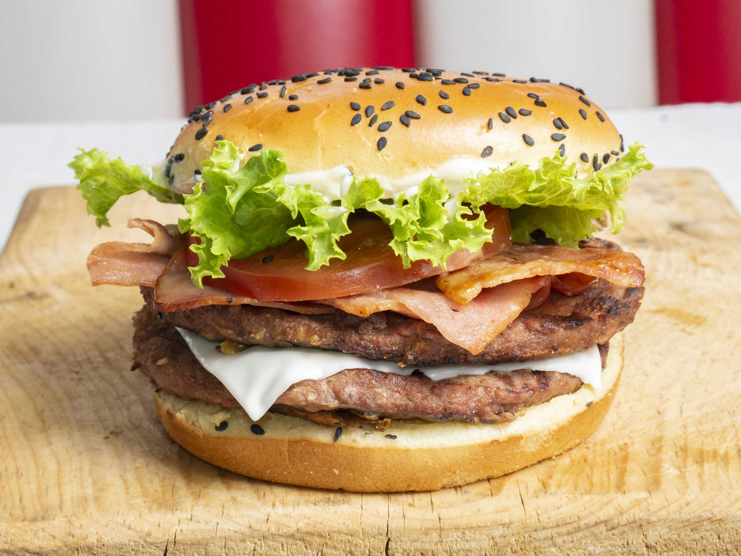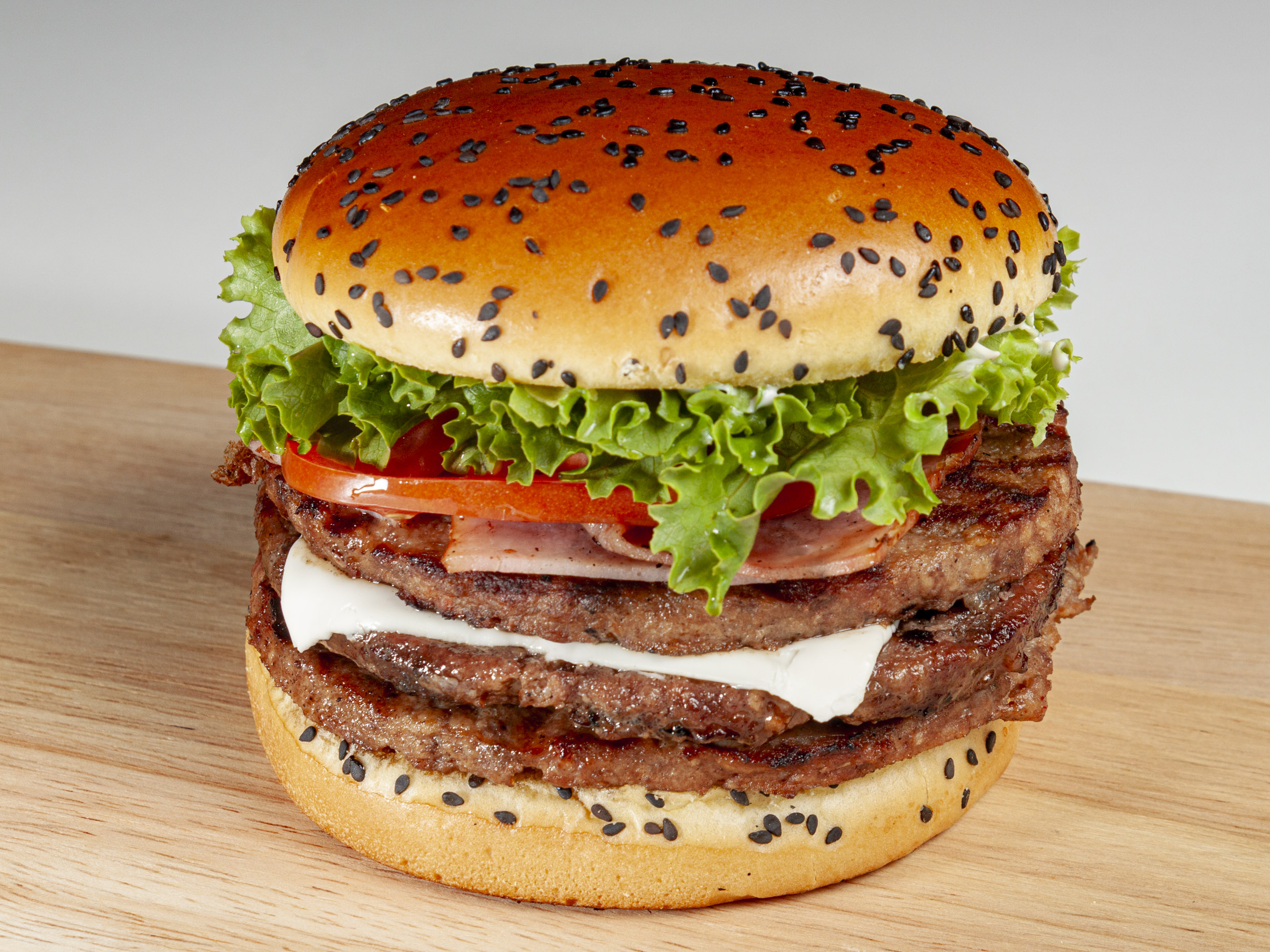 Hamburguesa doble con queso americano, tocino, cebolla caramelizada y salsa BBQ.