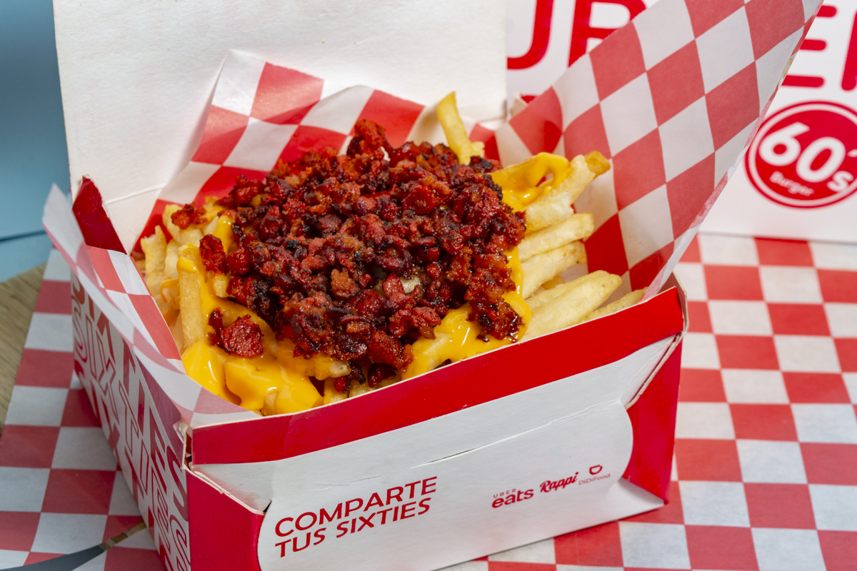 Papas a la francesa, queso cheddar, cebolla caramelizada y tocino.
