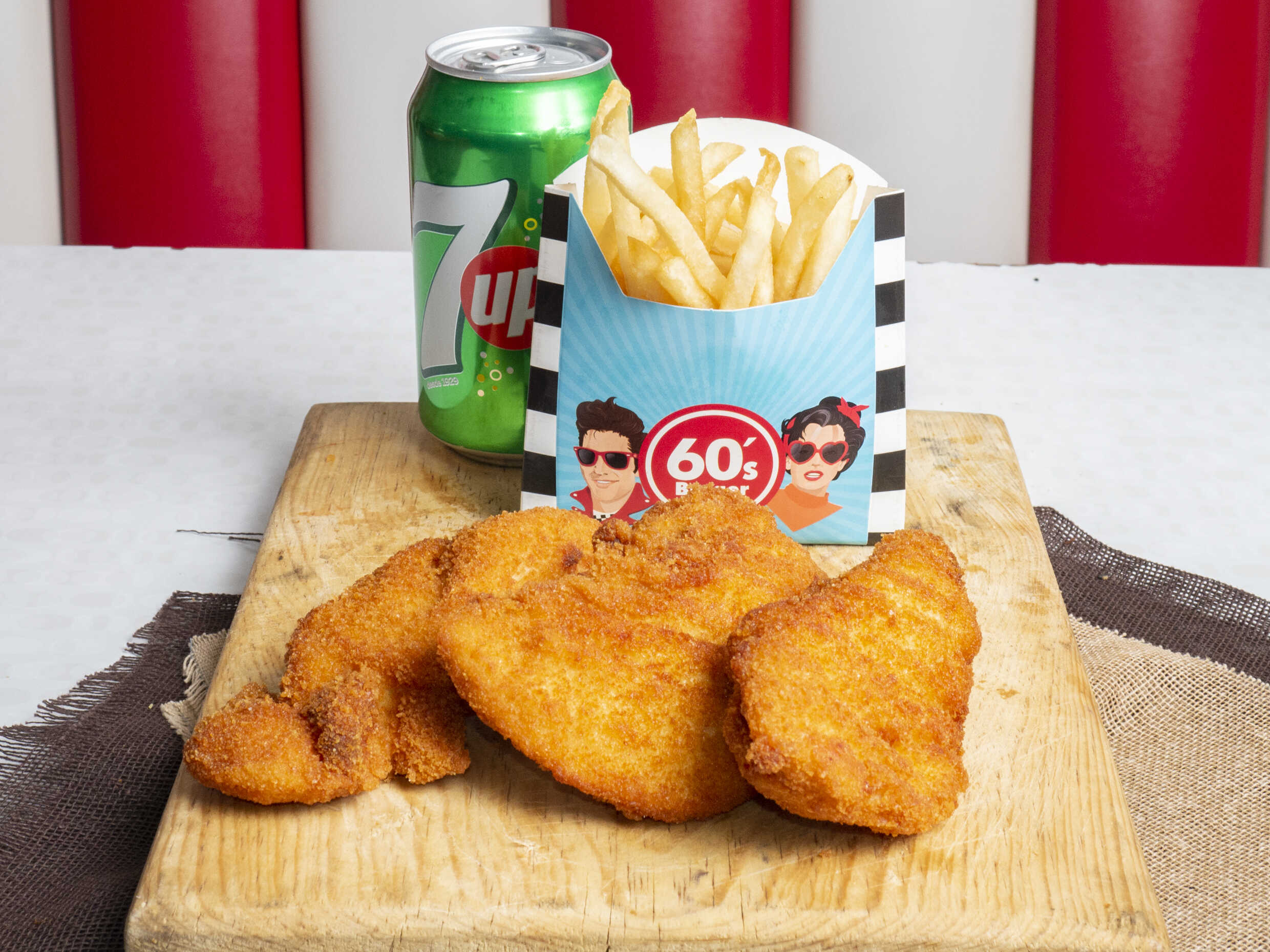 Boneless de pechuga de pollo 4 pzas, más deliciosas papas a la francesa medianas y crujientes.