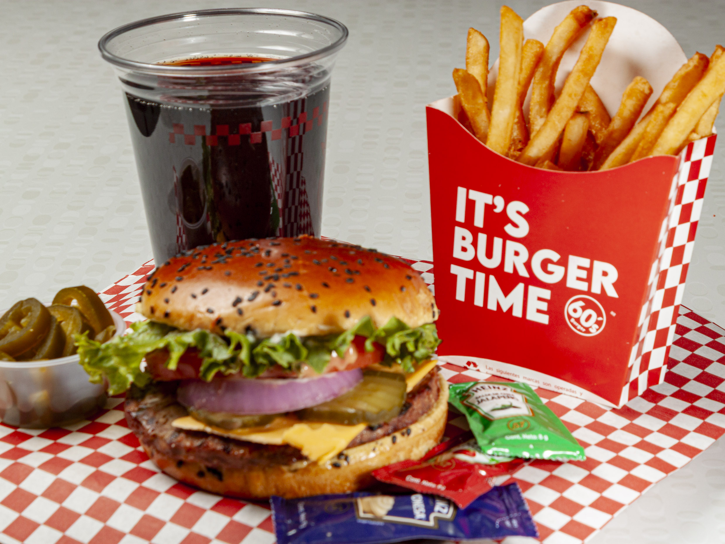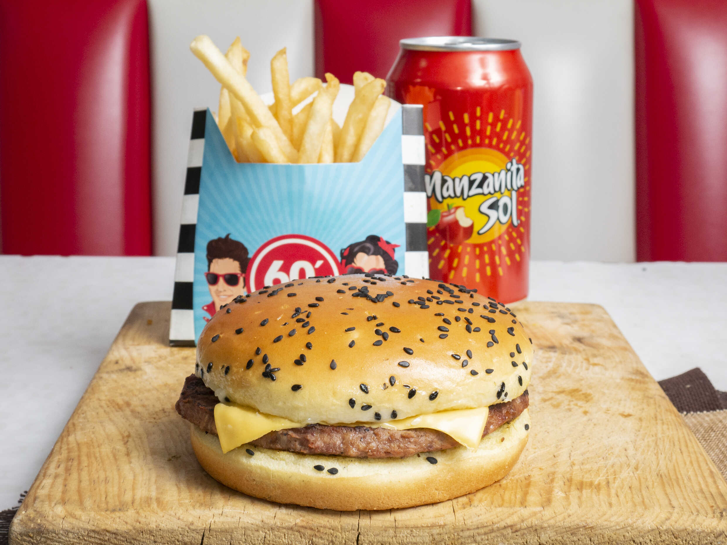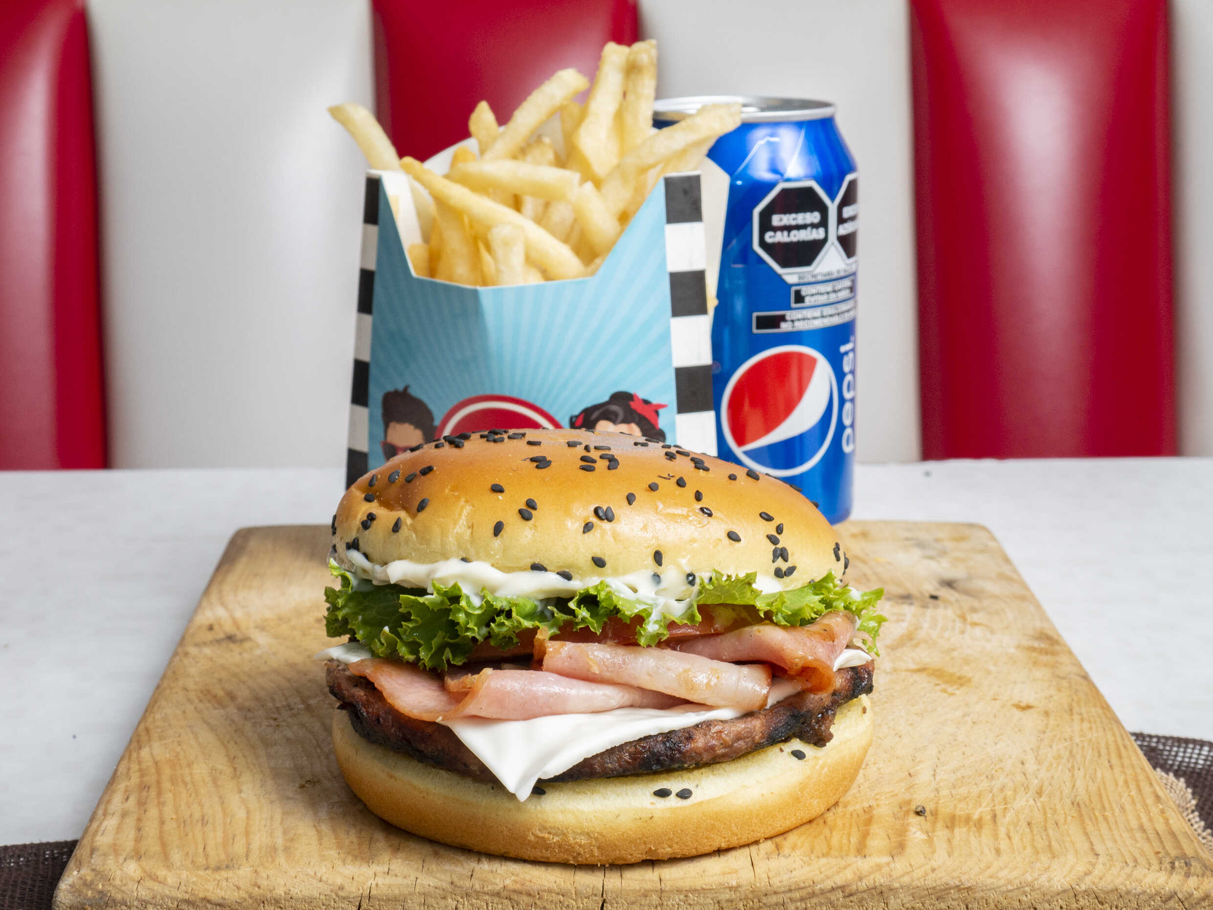 Hamburguesa sencilla, queso americano, papas a la francesa y refresco 355 ml a elección.