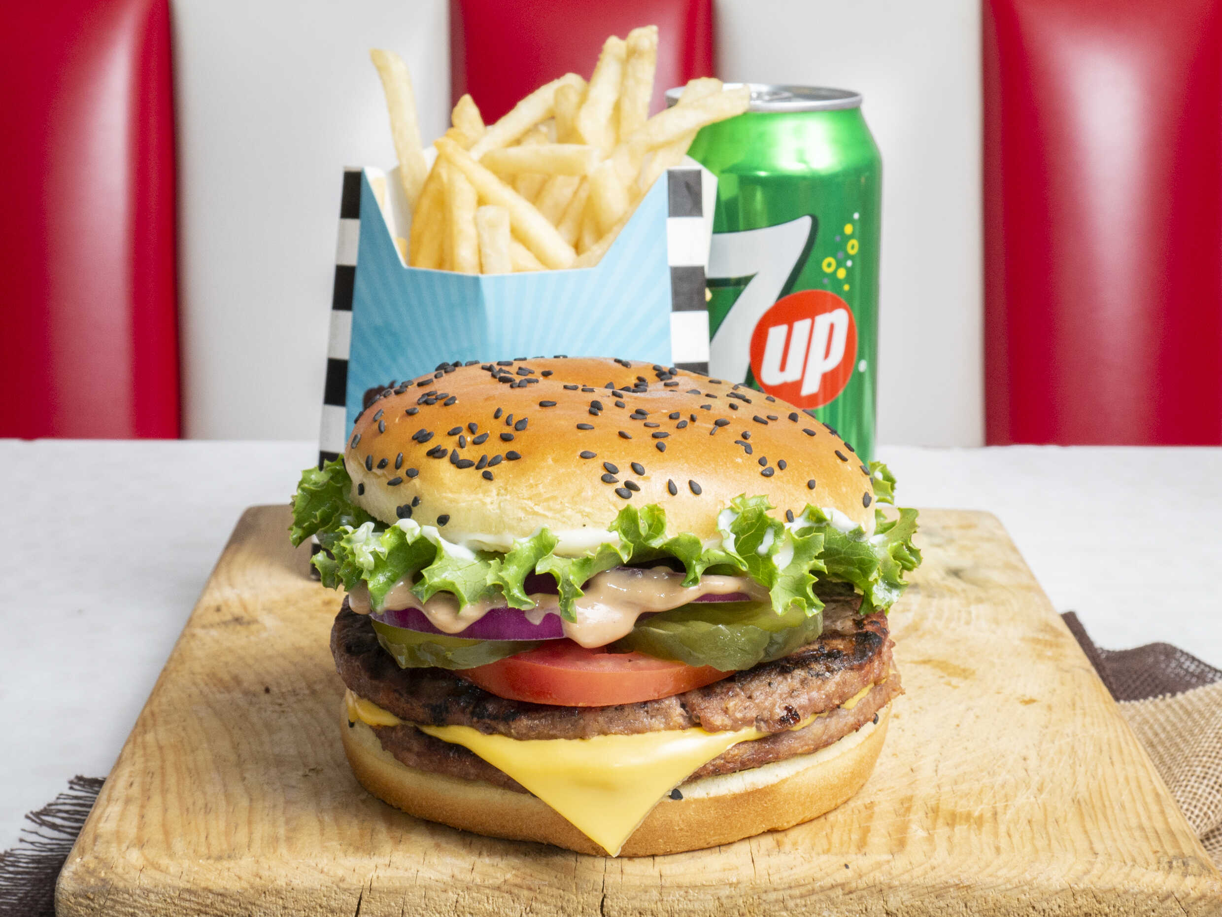 Hamburguesa Philadelphia doble, papas a la francesa medianas y refresco de 355 ml a elección.