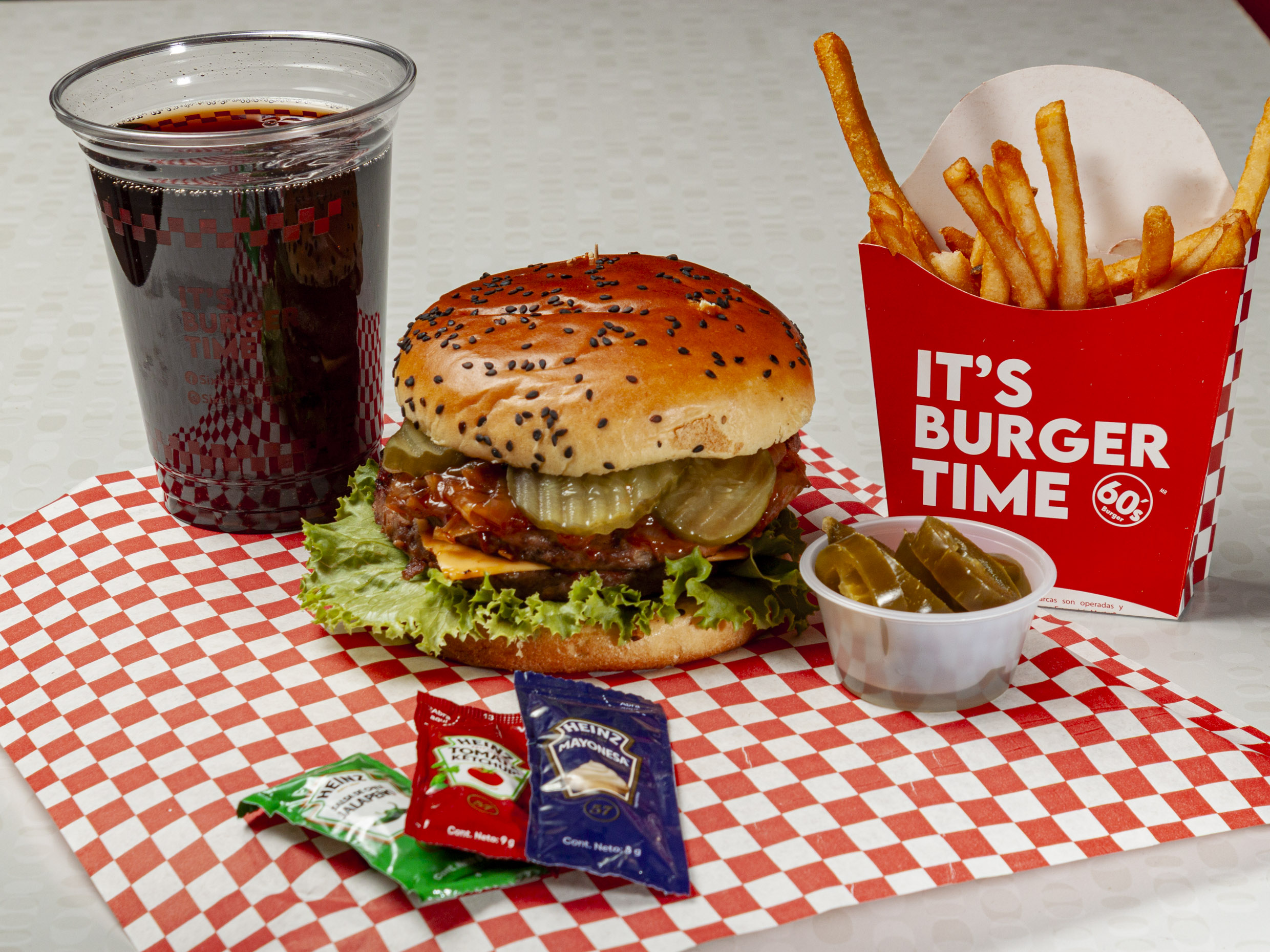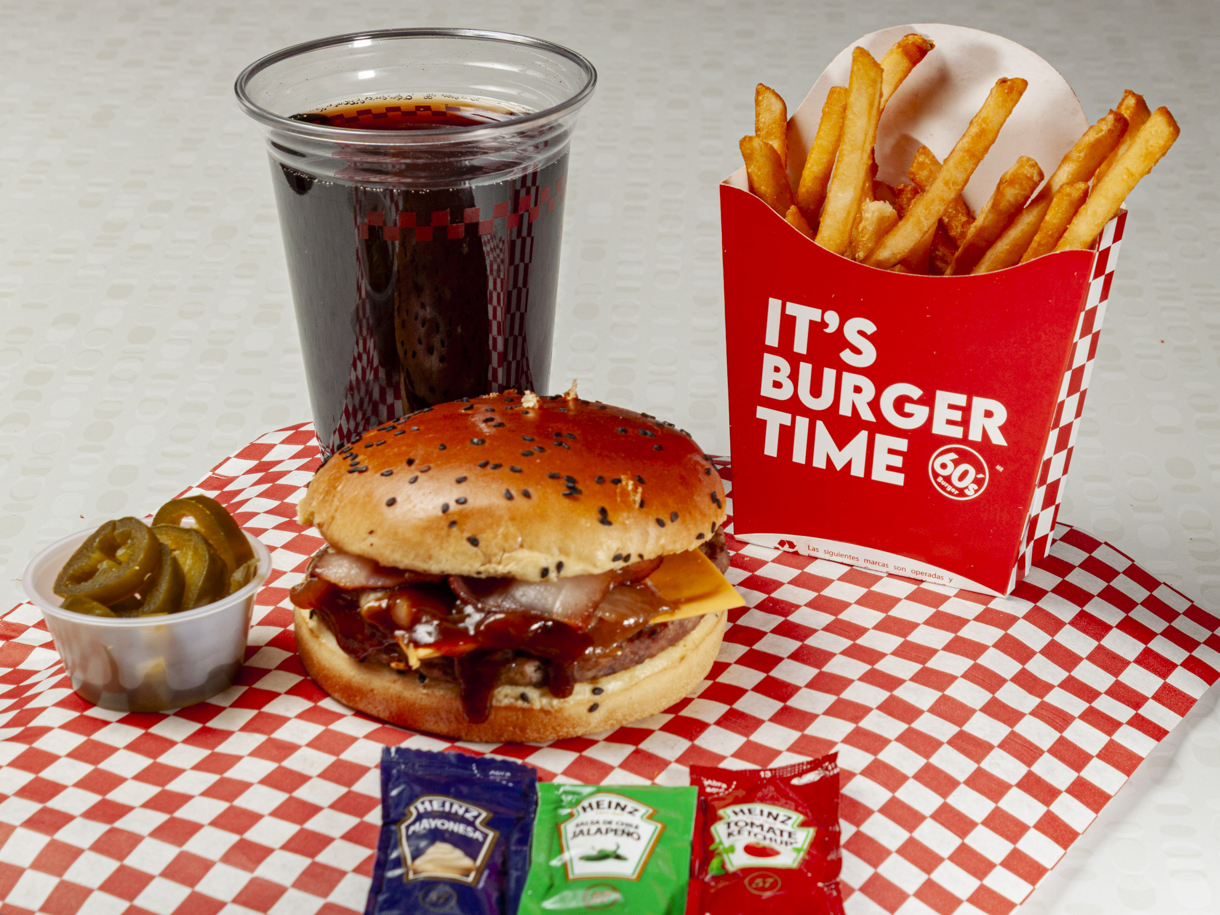 Hamburguesa bacon BBQ sencilla, papas a la francesa medianas y refresco de 355 ml a elección.