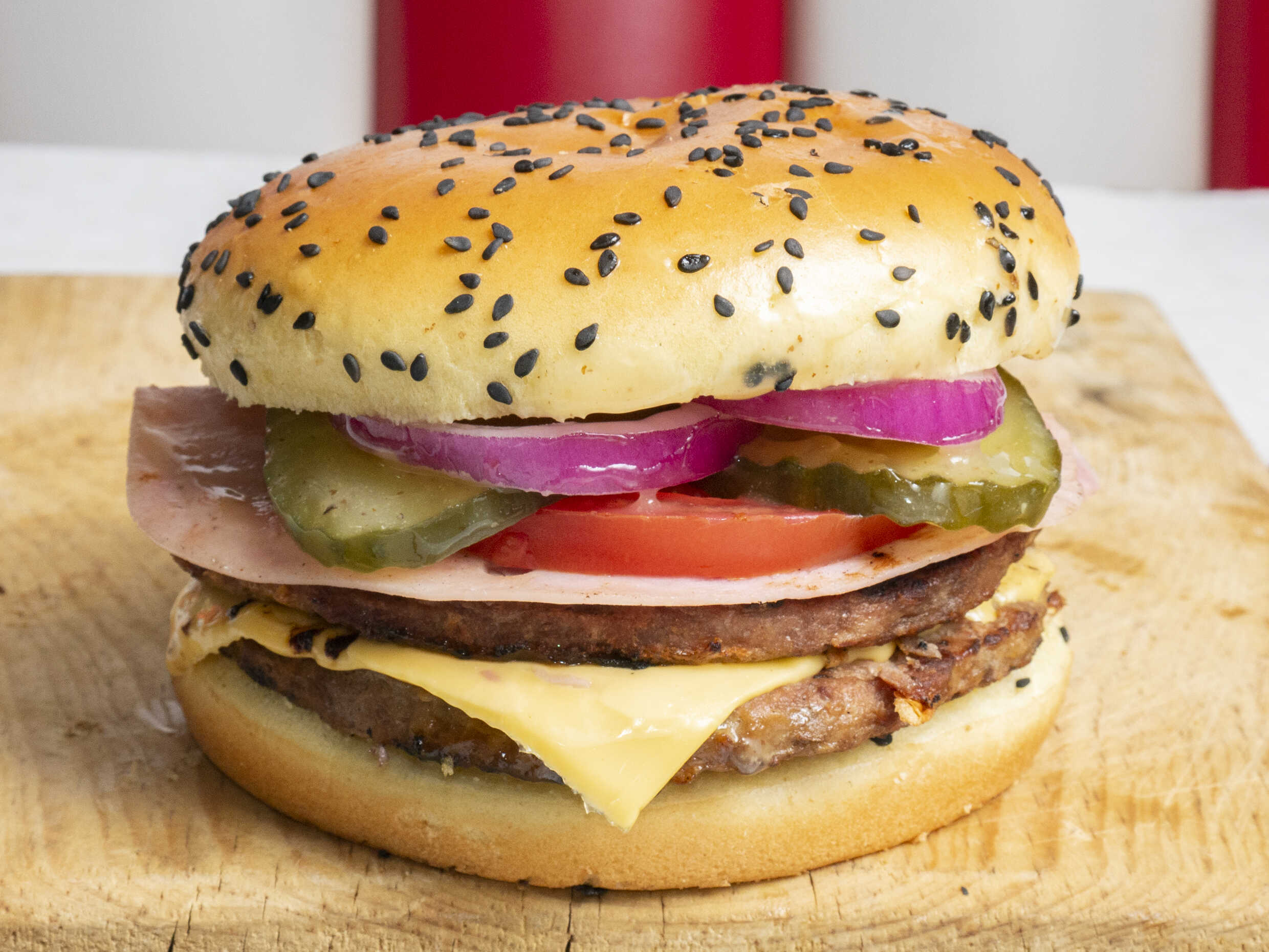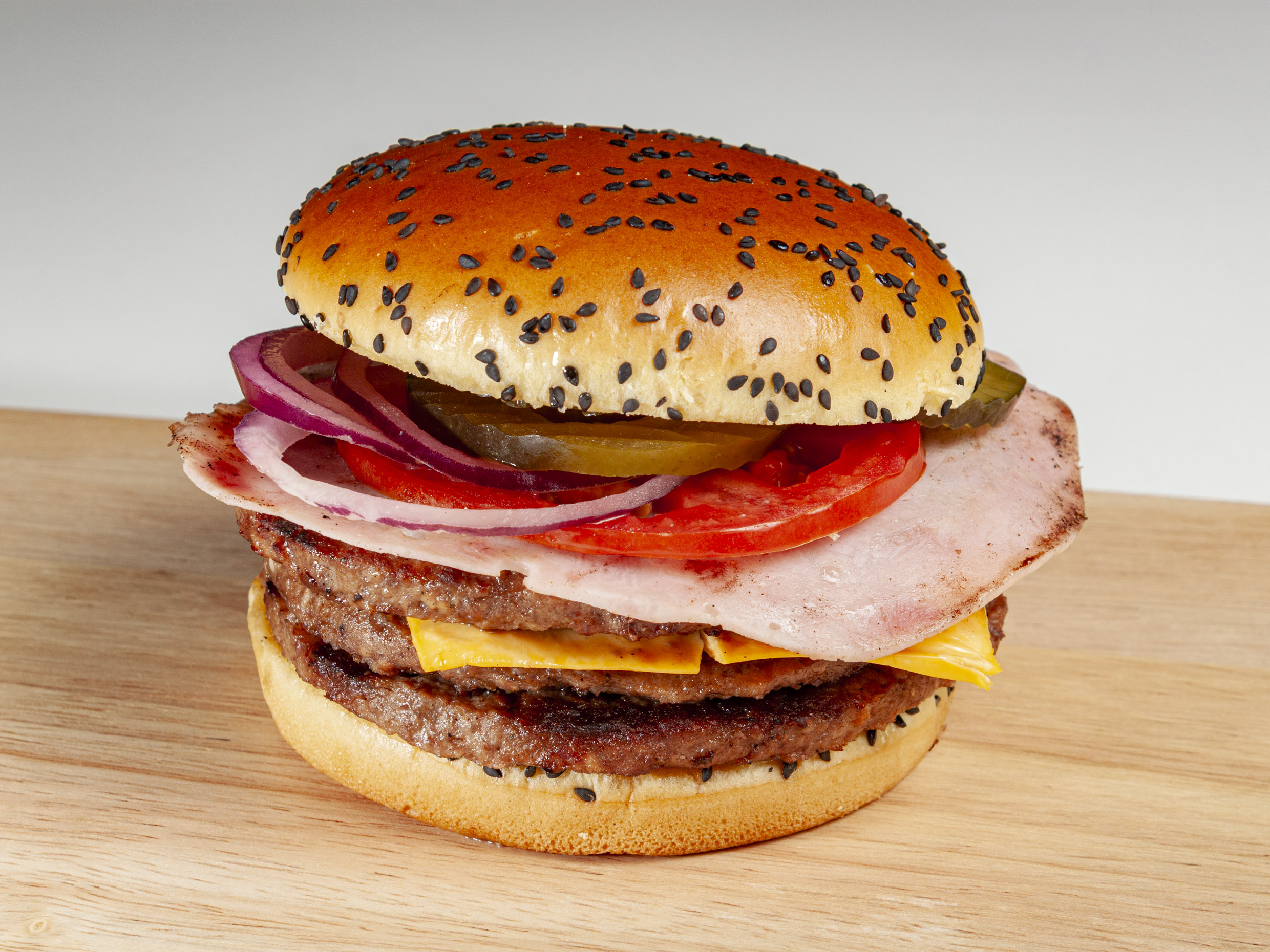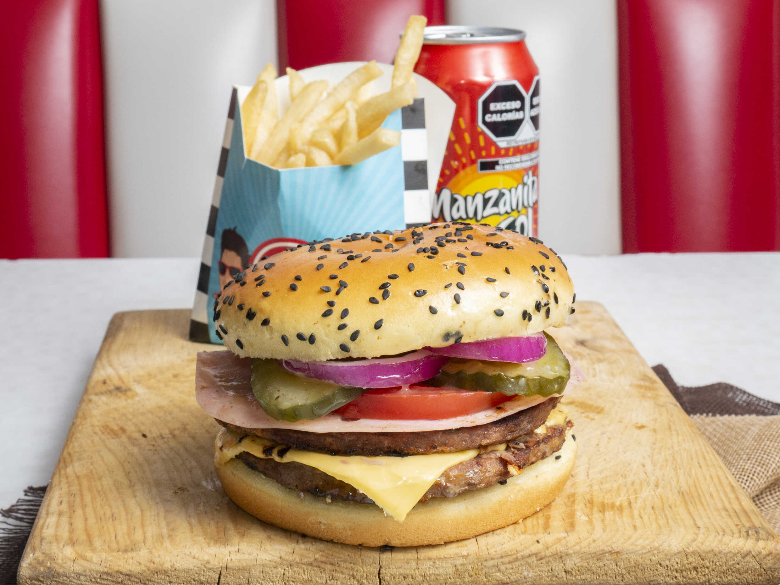 Hamburguesa doble, queso americano, jamón, pepinillos, cebolla morada, jitomate y mostaza dulce.