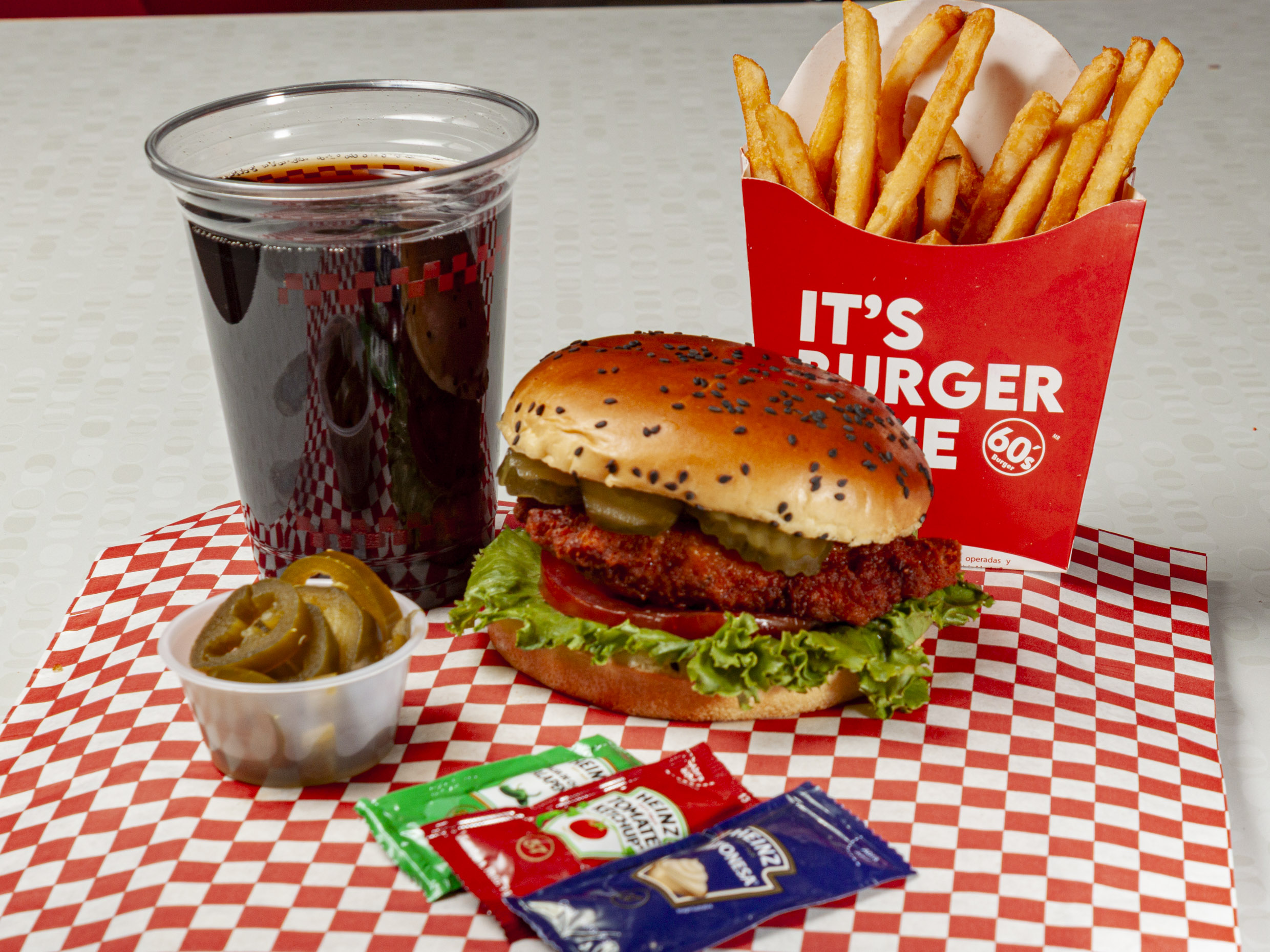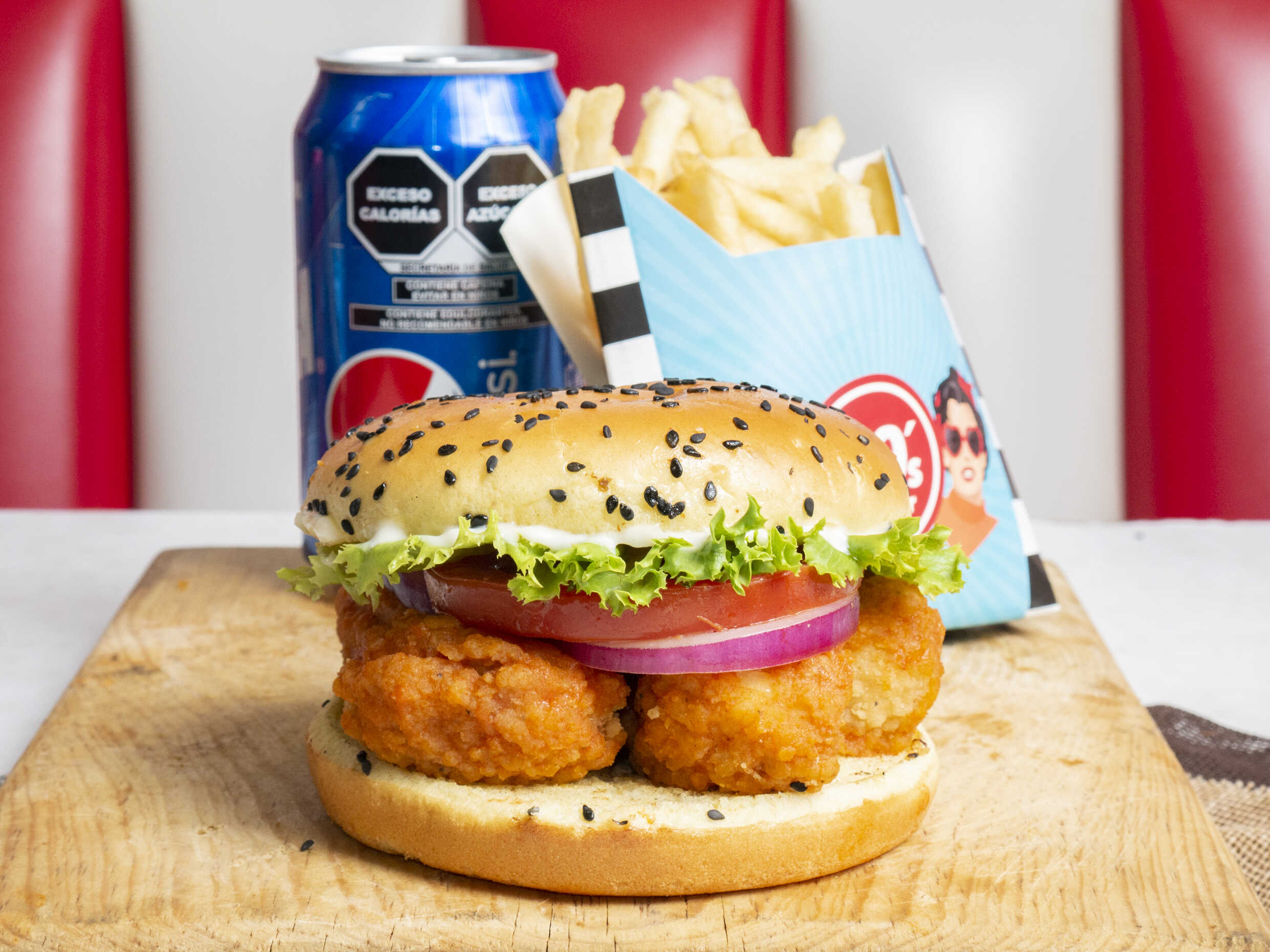 Hamburguesa de pechuga de pollo crujiente, acompañada de papas a la francesa medianas y un refresco de 355 ml a tu elección.