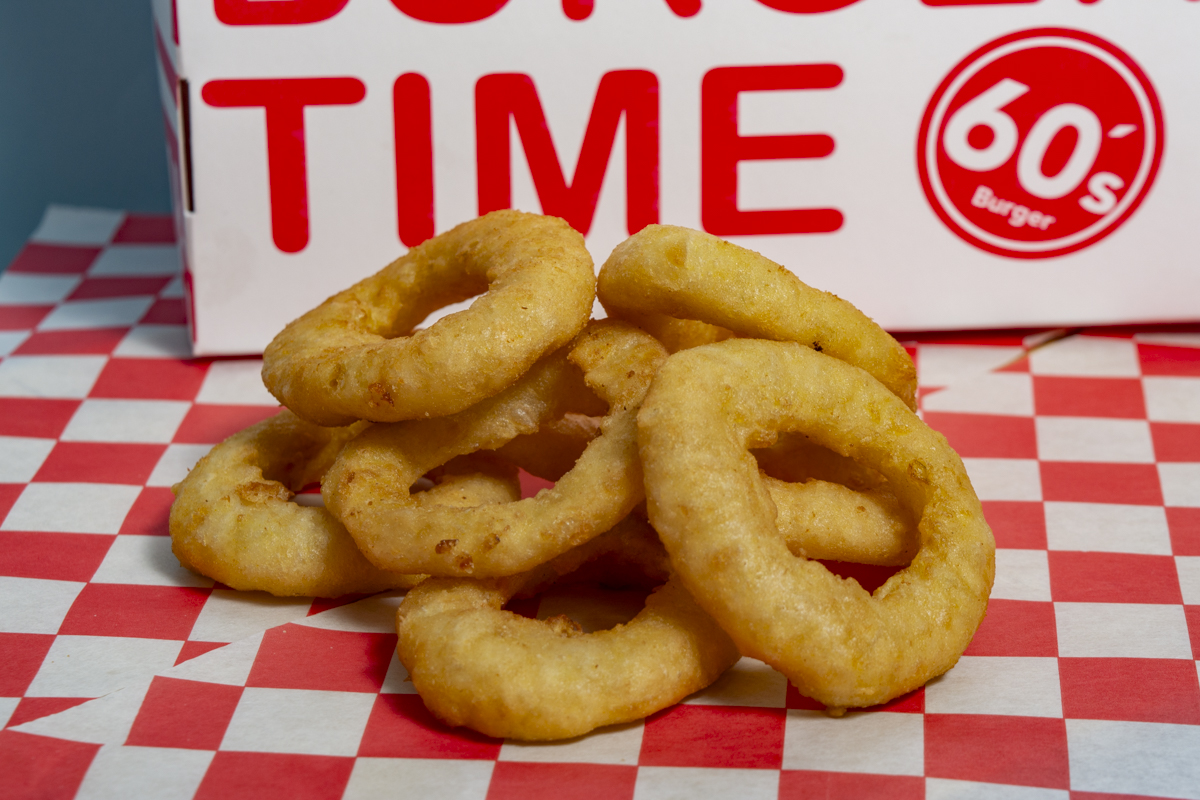Hamburguesa sencilla con queso americano, tocino, salsa BBQ y 3 aros de cebolla, acompañada de papas medianas (110 g).