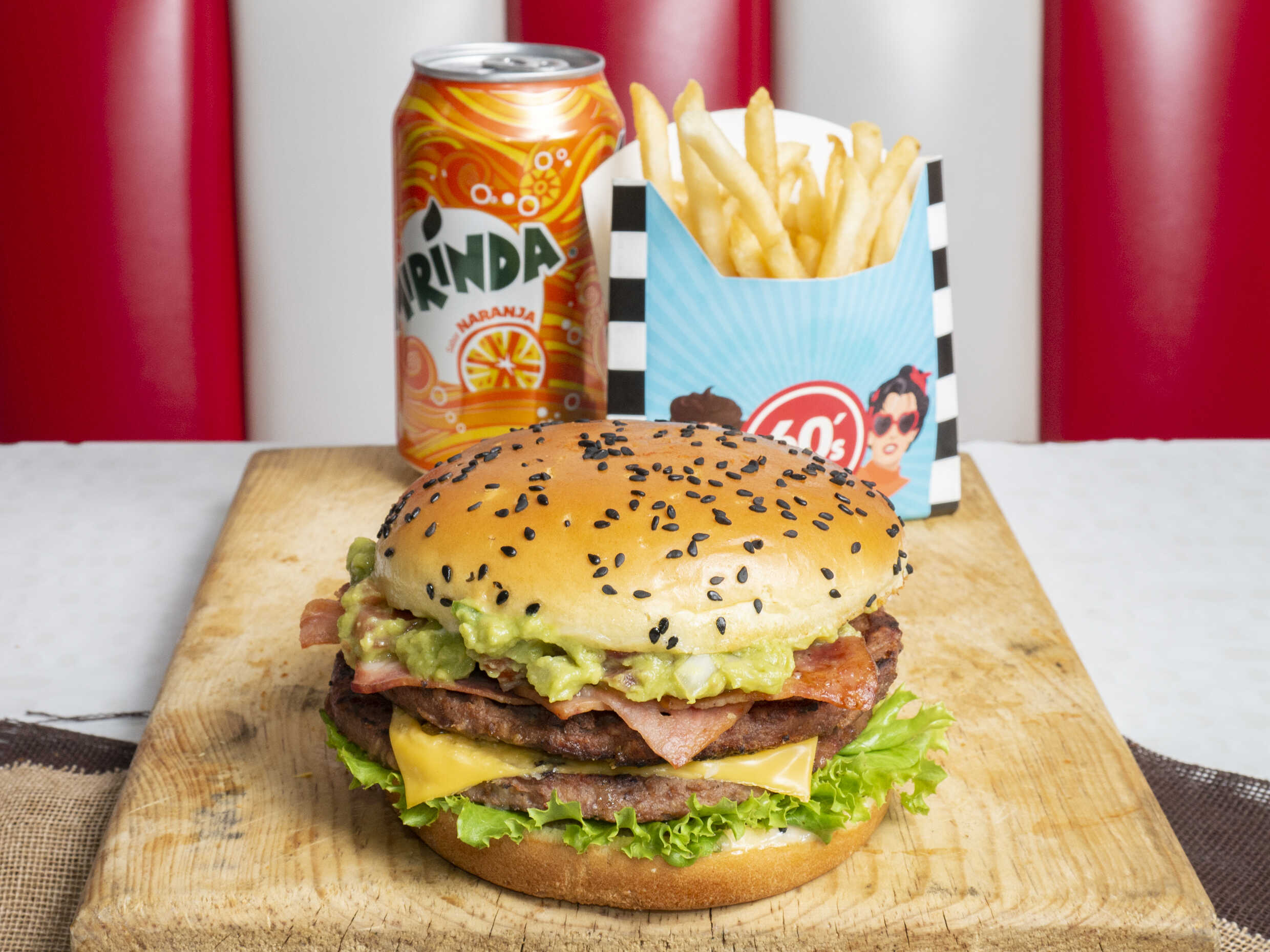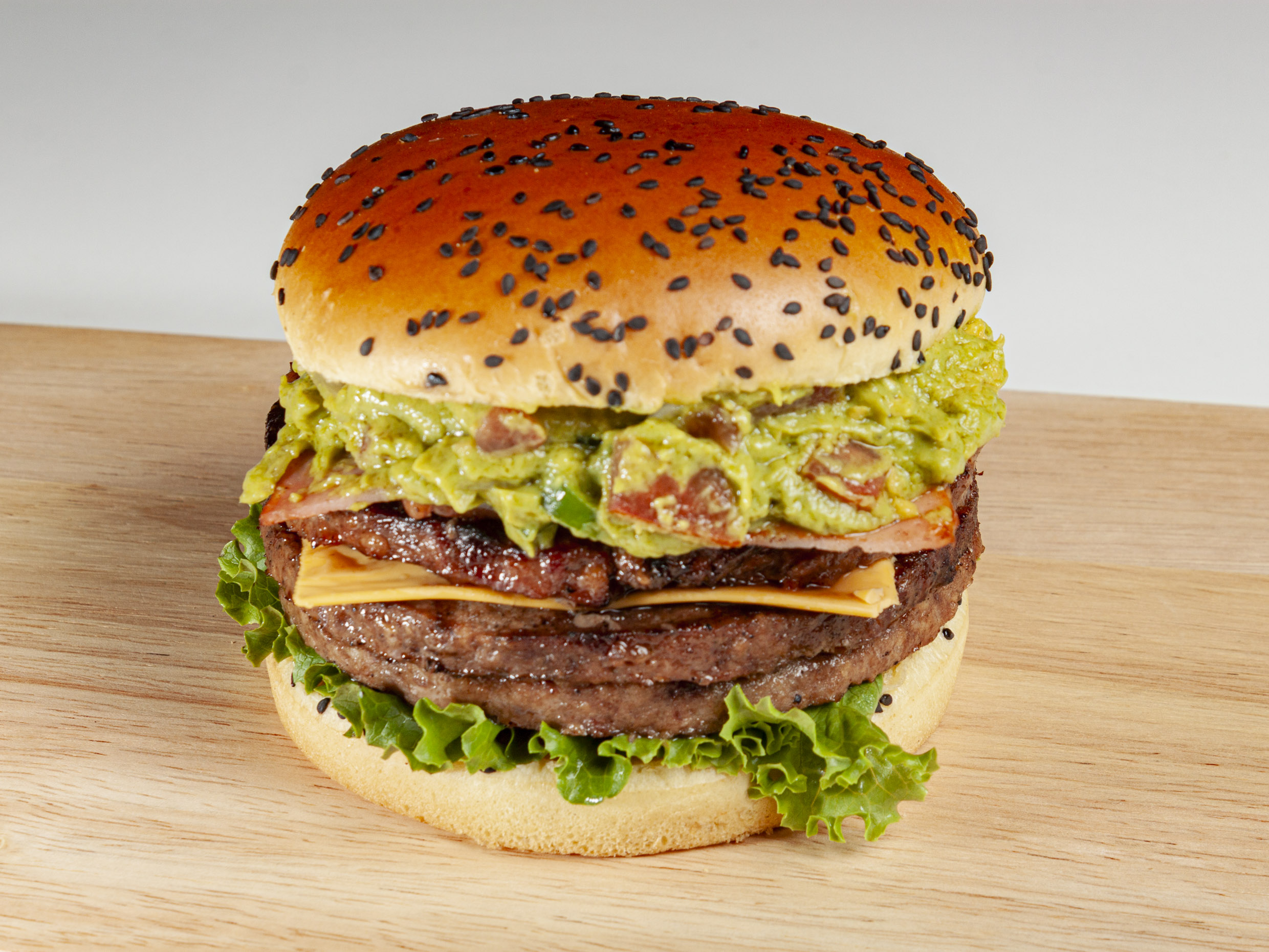 Hamburguesa doble con queso amarillo, tocino, lechuga y 50 gramos de delicioso guacamole preparado, papas medianas y refresco.