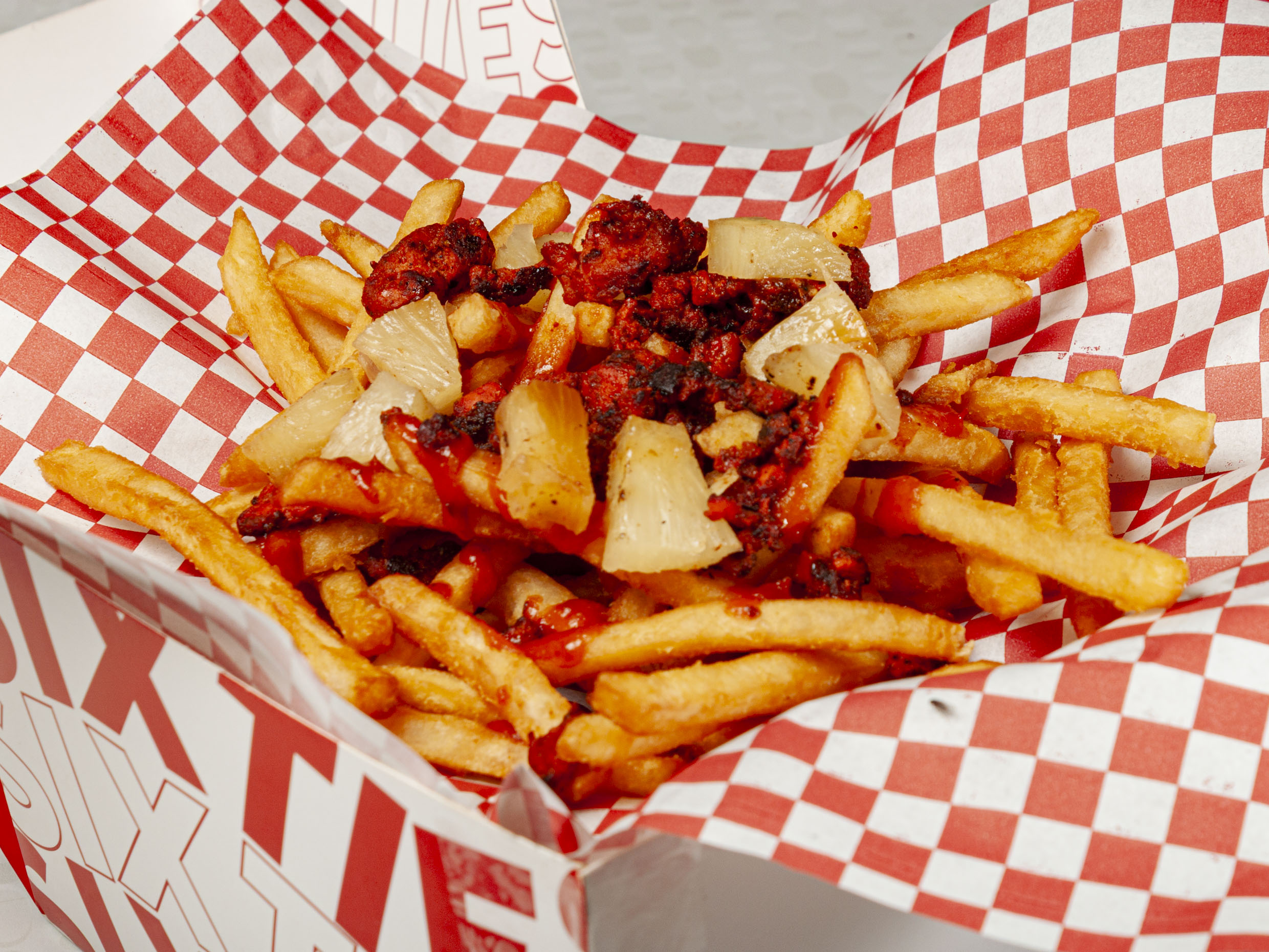 Deliciosas papas a la francesa con carne al pastor, piña y aderezo chipotle.