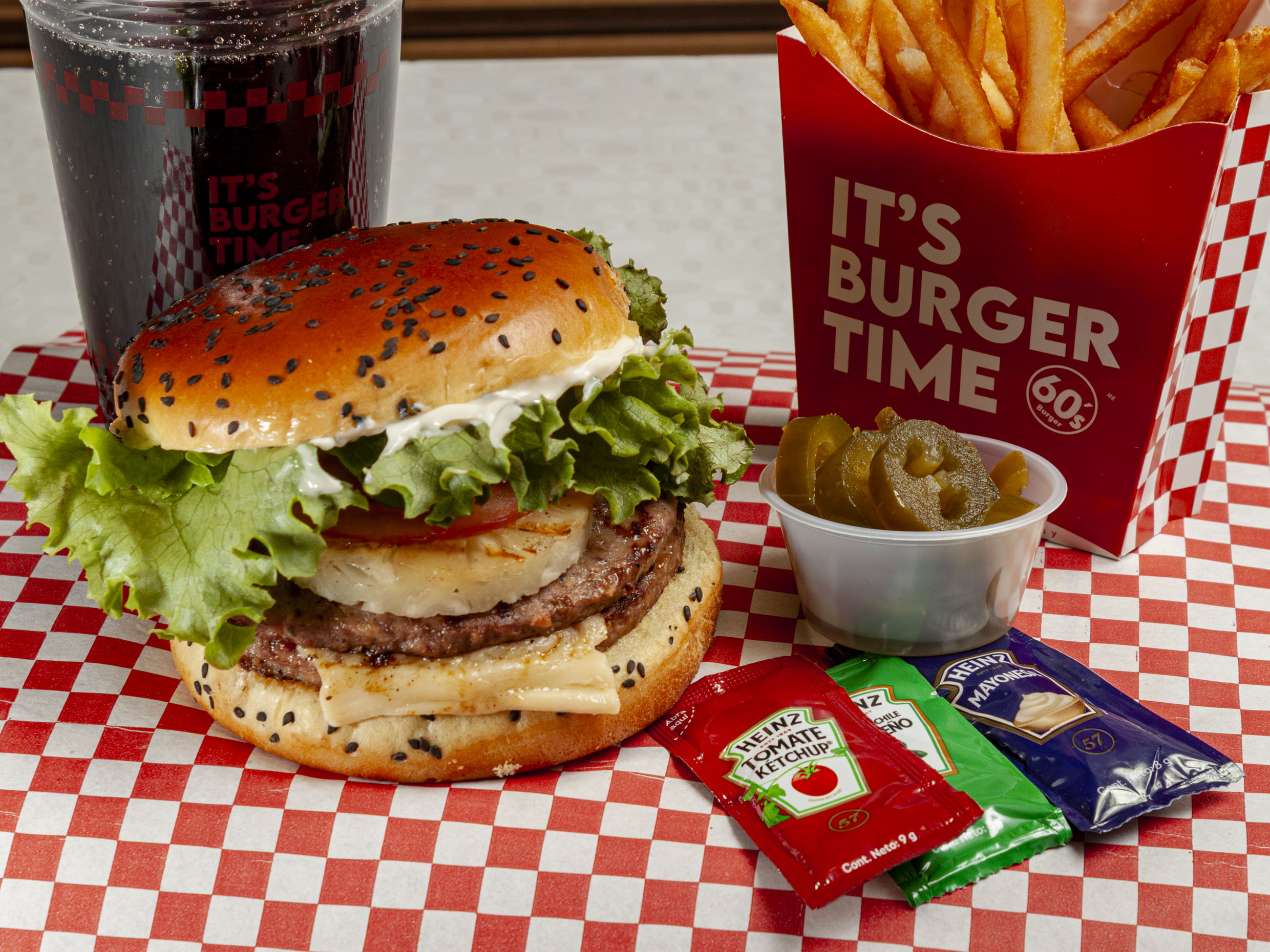 Hamburguesa doble, queso manchego, piña a la parrilla, mayonesa, lechuga y jitomate.