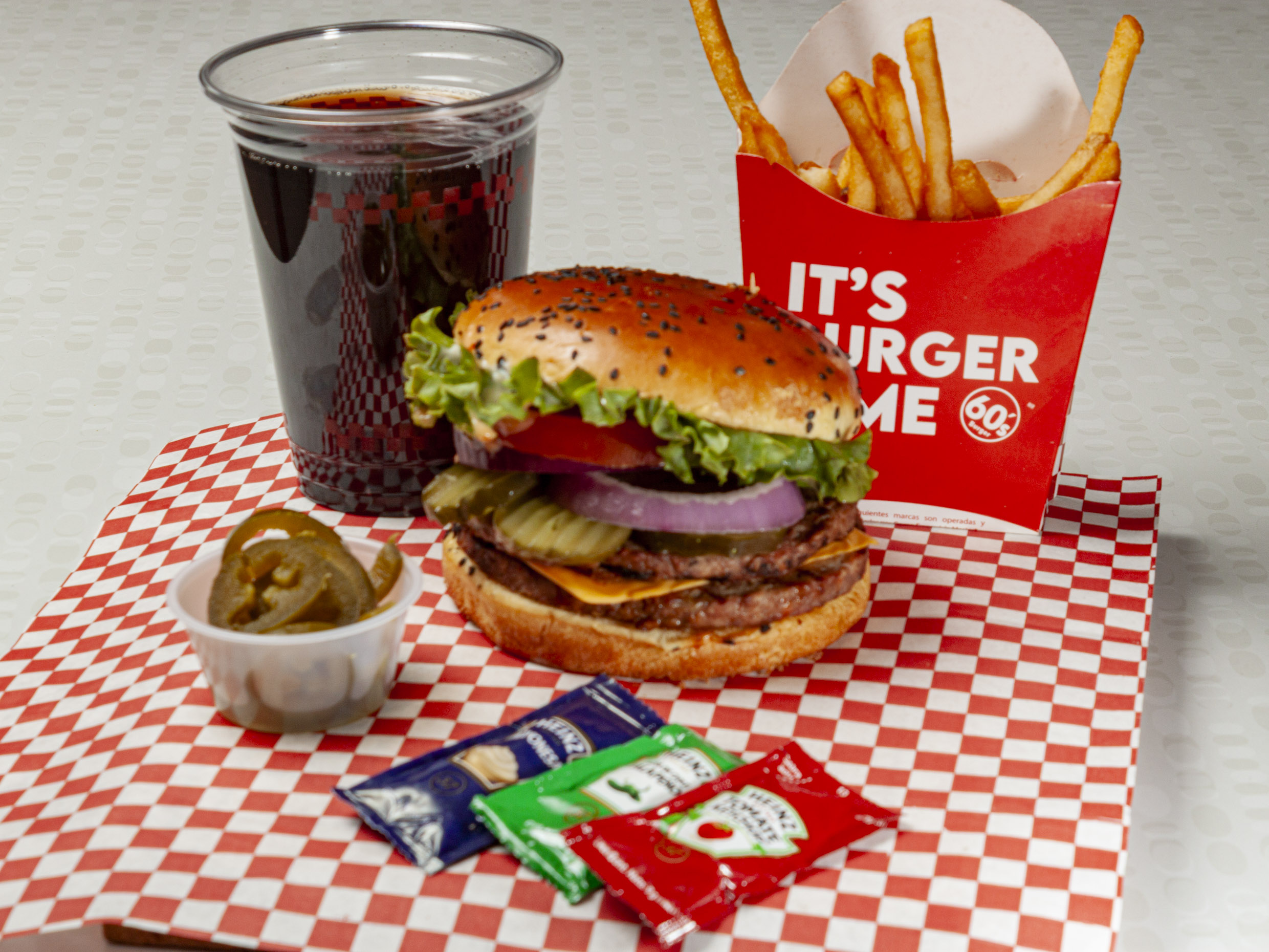 Hamburguesa original doble, papas a la francesa medianas y refresco de 355 ml a elección.