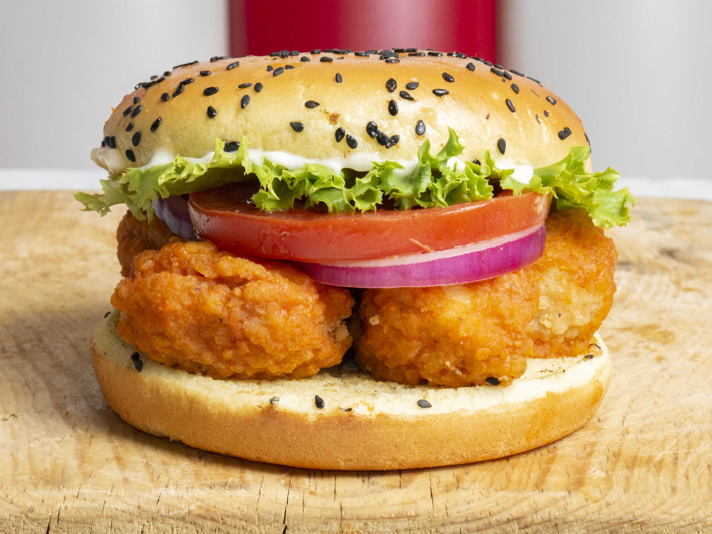 Hamburguesa de boneless salseados en xtra hot buffalo, mango habanero o BBQ, lechuga, jitomate, cebolla morada y mayonesa.
