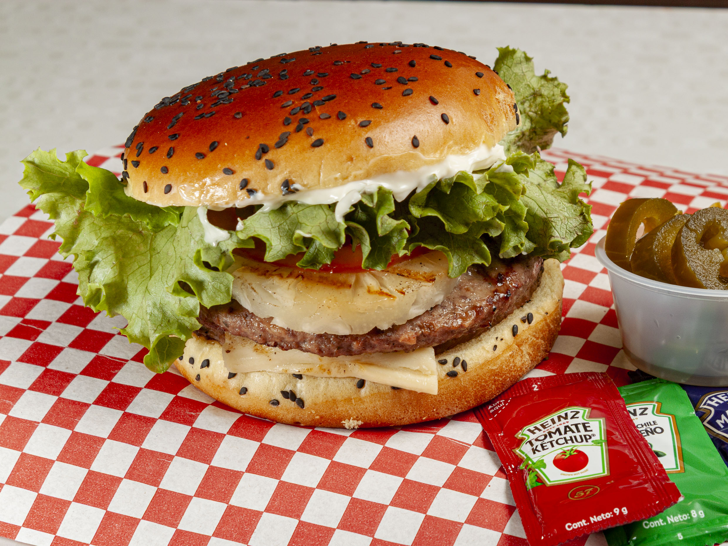 Hamburguesa sencilla con queso manchego, piña a la parrilla, mayonesa, lechuga y jitomate.