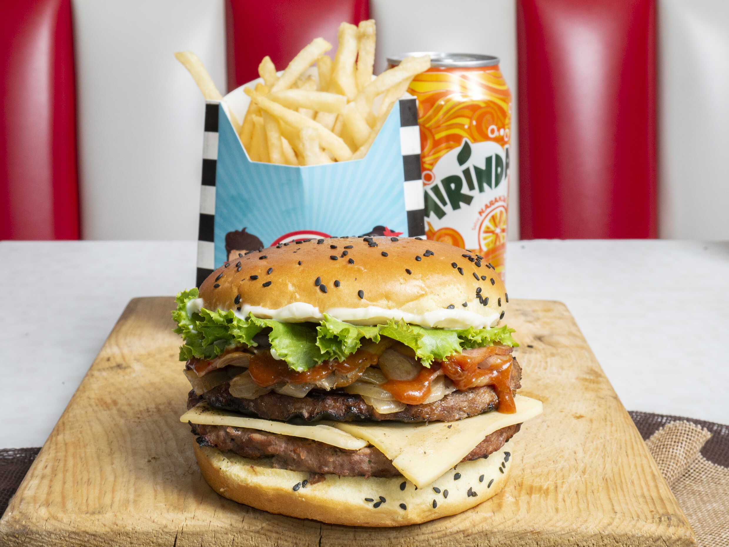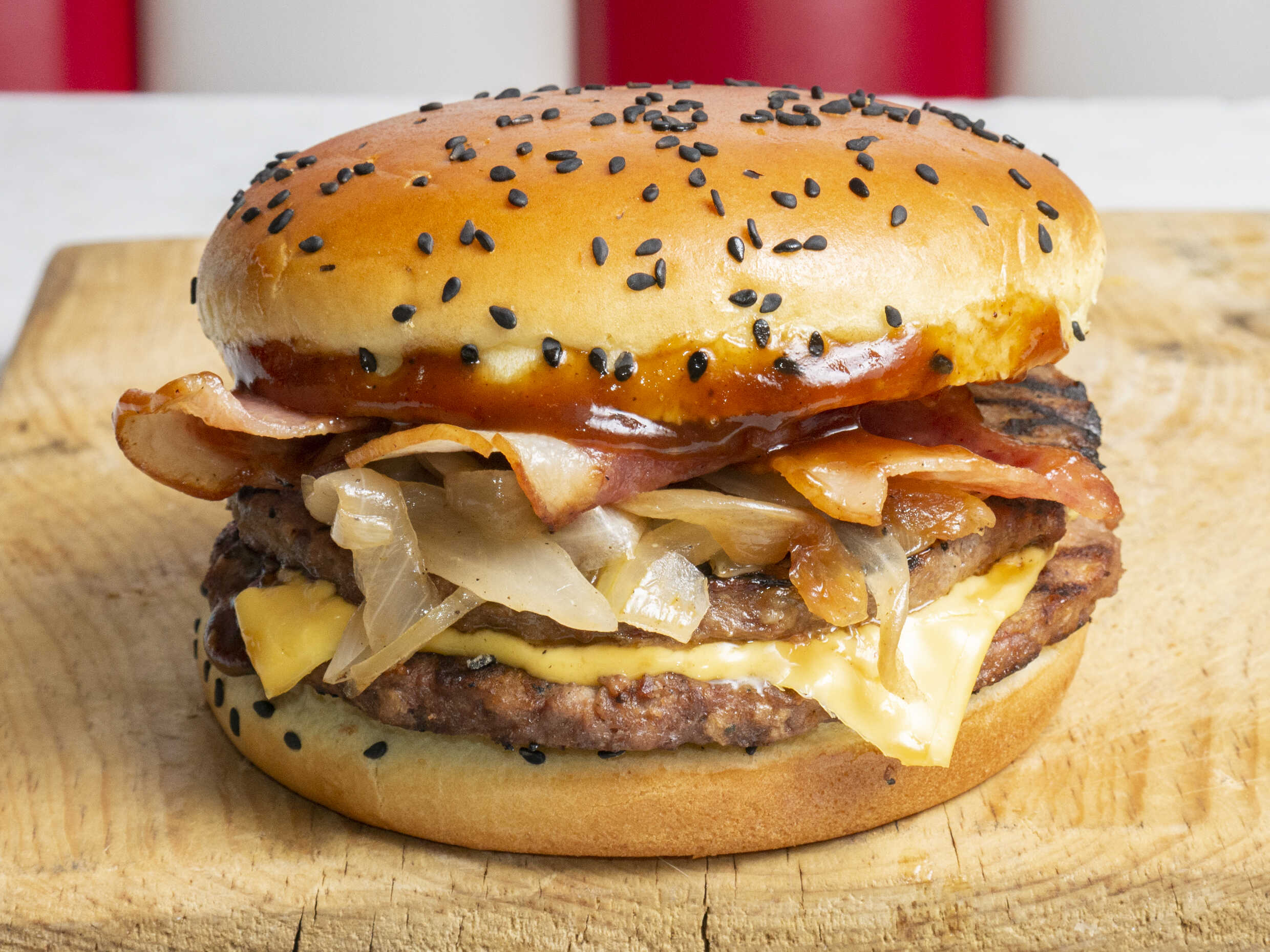 Hamburguesa doble con queso americano, tocino, cebolla caramelizada y salsa BBQ.