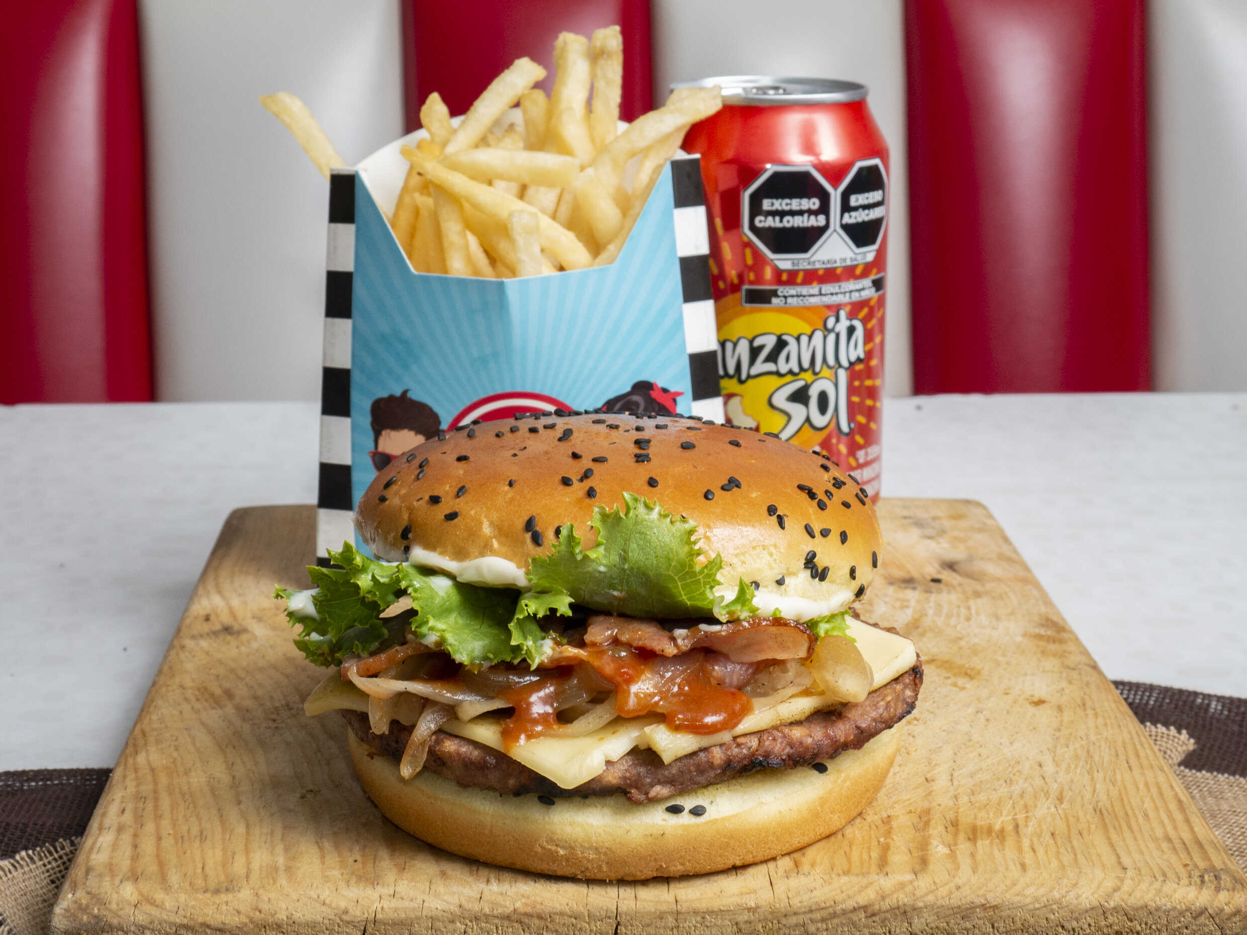 Hamburguesa sencilla, queso americano, papas a la francesa y refresco 355 ml a elección.