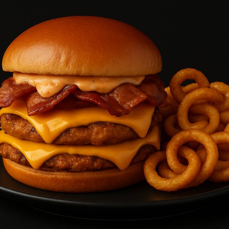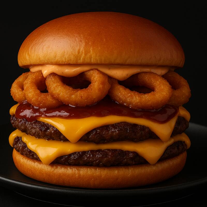 CARNE SMASH + DOBLE QUESO AMERICANO + AROS DE CEBOLLA + SALSA BBQ + ADEREZO CHIPOTLE + ADEREZO ESPECIAL