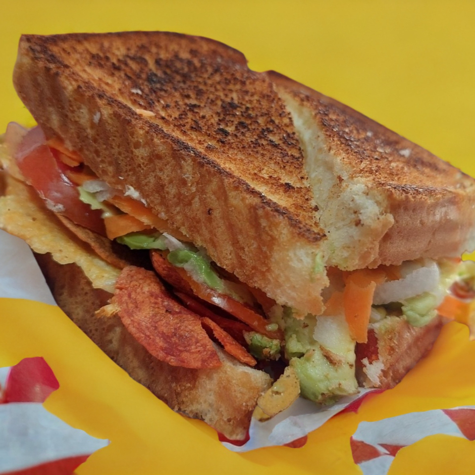 Un sándwich relleno de queso crema, queso manchego y a elegir nuggets, Champiñones o Huevo , acompañado de zanahoria, jícama, pepino, aguacate y jitomate.