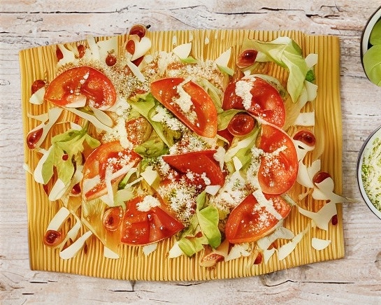 Chicharrón frito en casa, acompañado de col, cueritos, jitomate y aguacate, cambialo a su versión veggie y cambia los cueros por cacahuates o gomitas, va separado para que no se remoje.