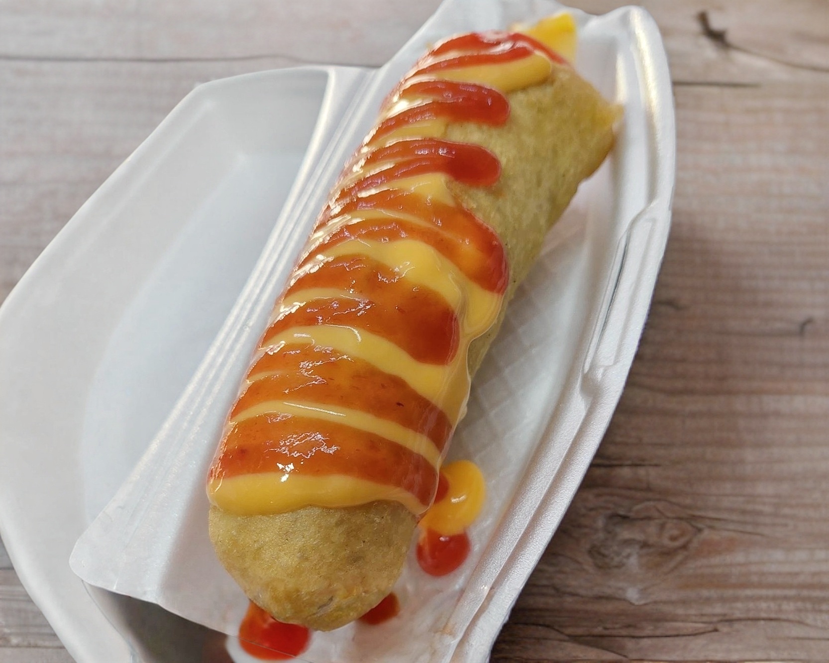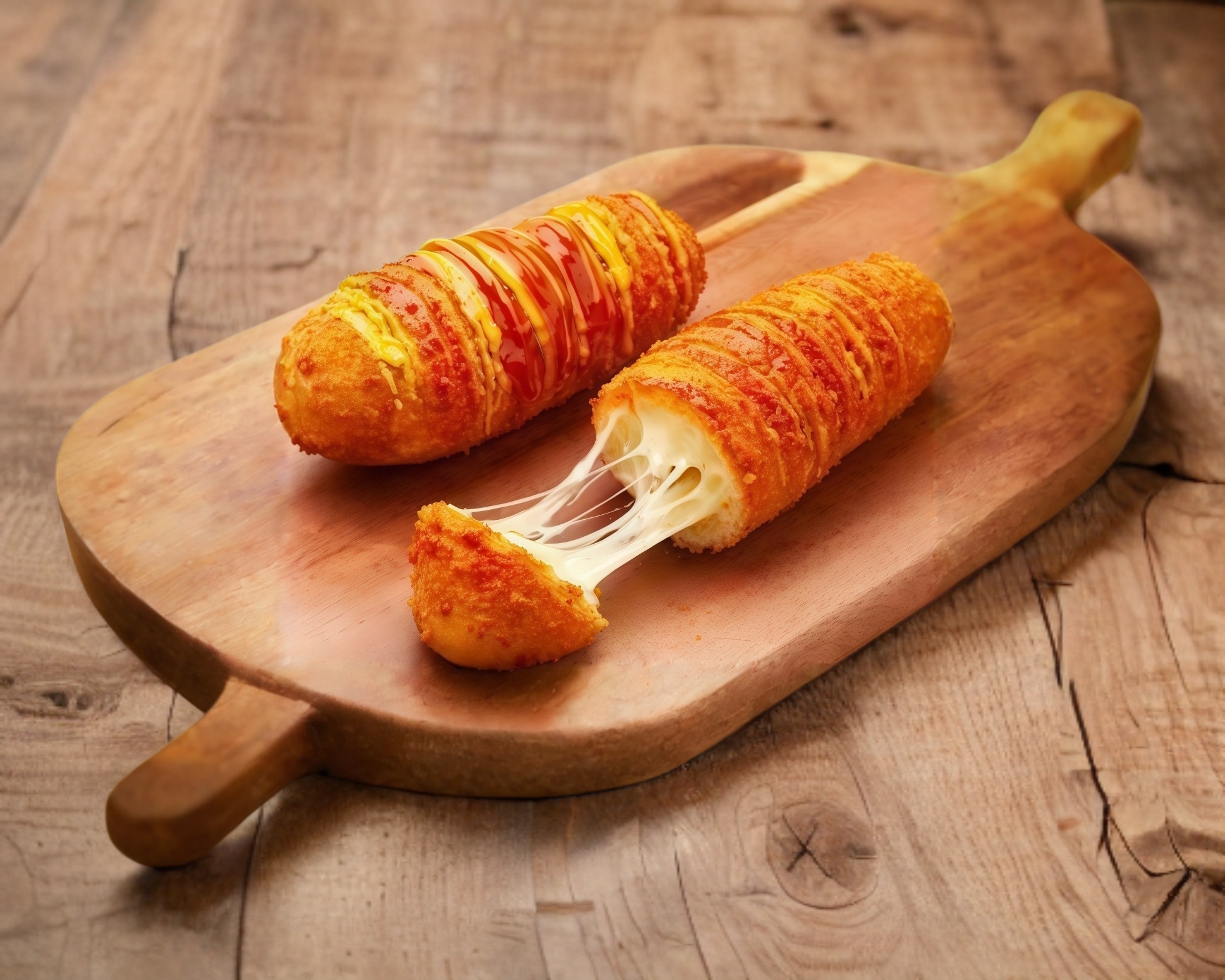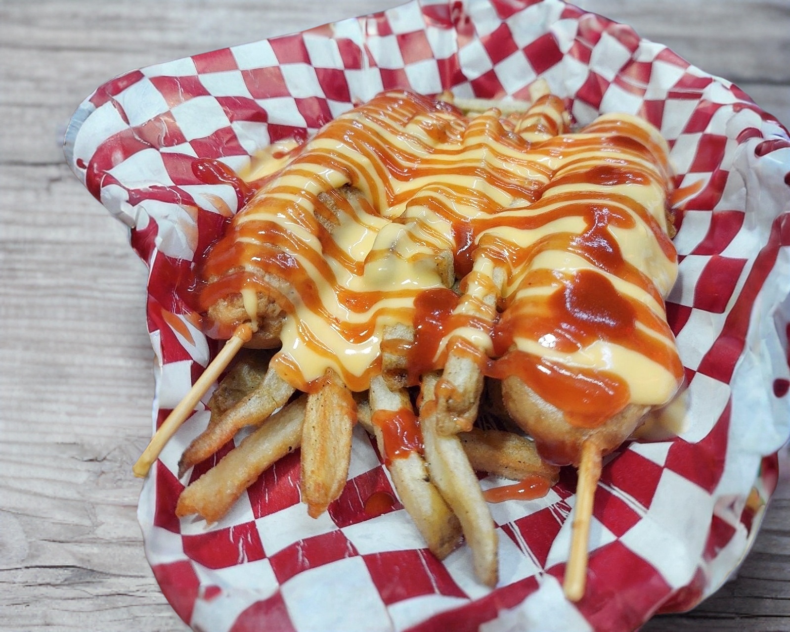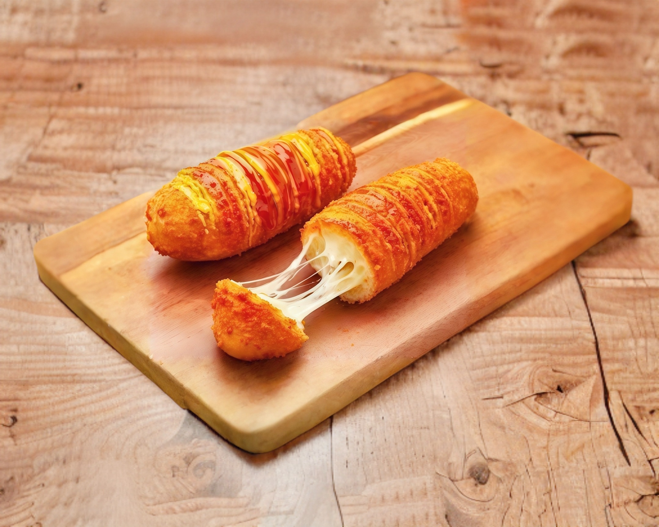 Una rechoncha banderilla de queso manchego, acompañada de tus aderezos, agrega papas a la francesa o nachos.