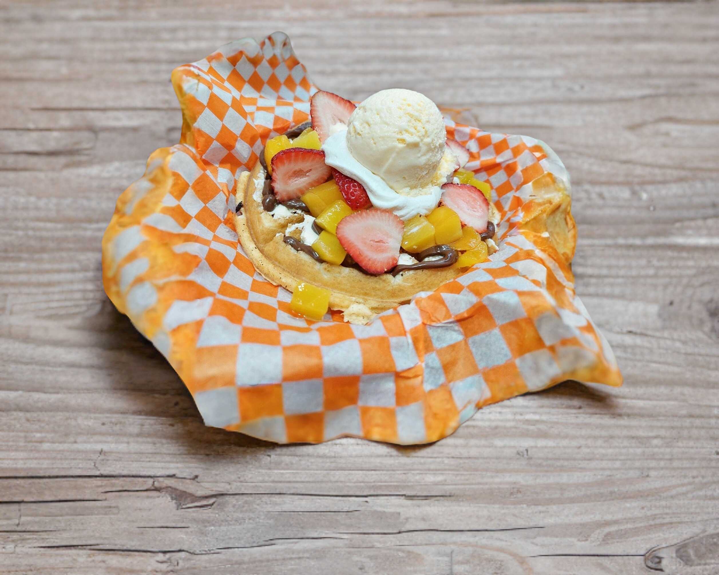 Rica pieza de waffle doradito, acompañado de 2 untables, un toque de crema batida con una fruta y una bolita de helado de vainilla.