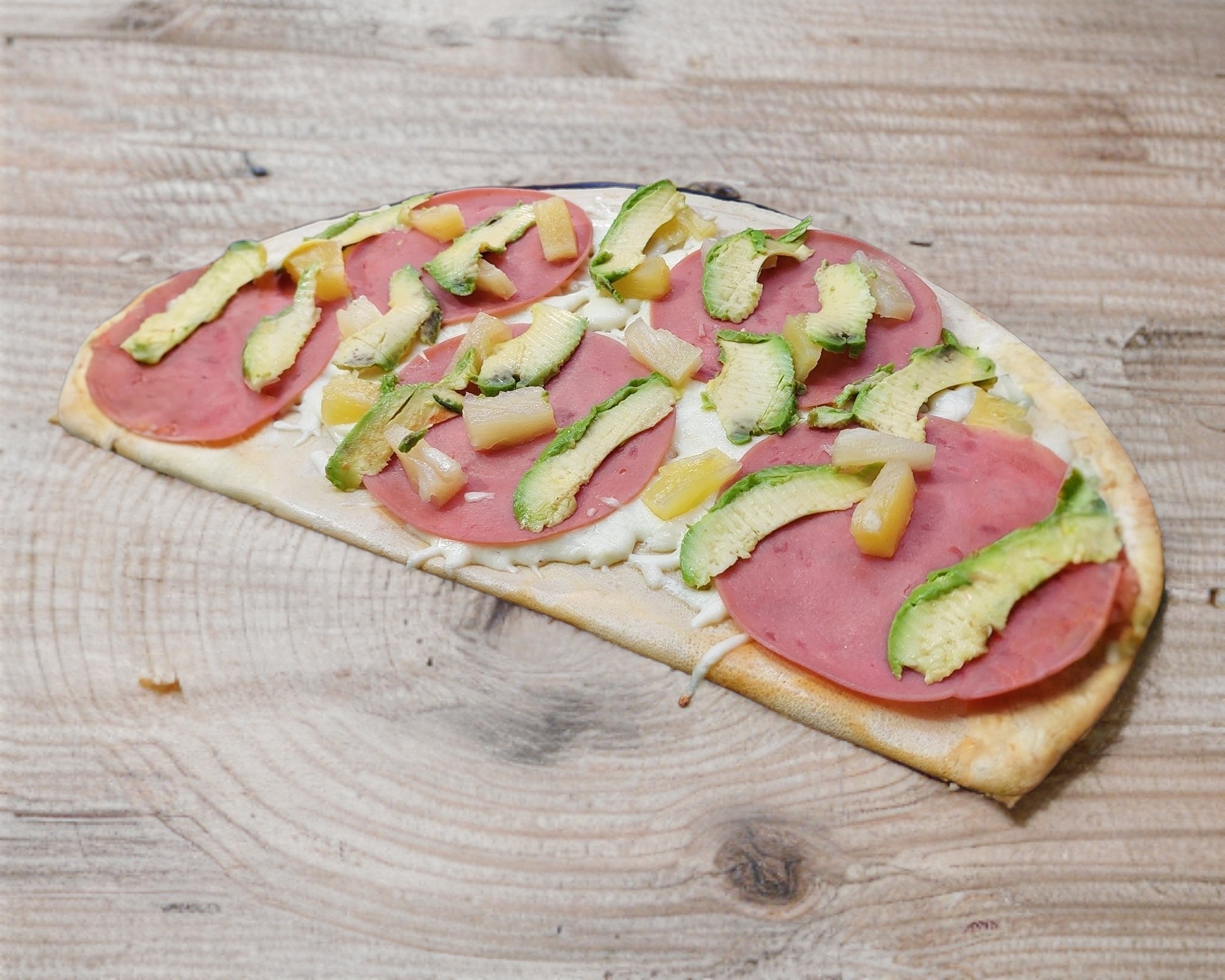 Un sándwich relleno de queso crema, queso manchego, salchicha, jamón y pepperoni, de todo un poco, acompañado de zanahoria, jícama, pepino, aguacate y jitomate.