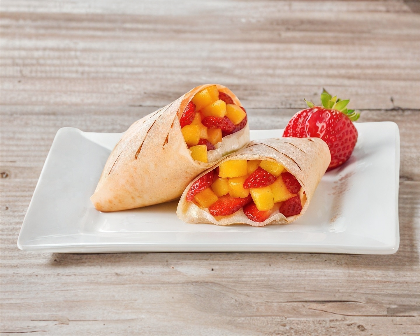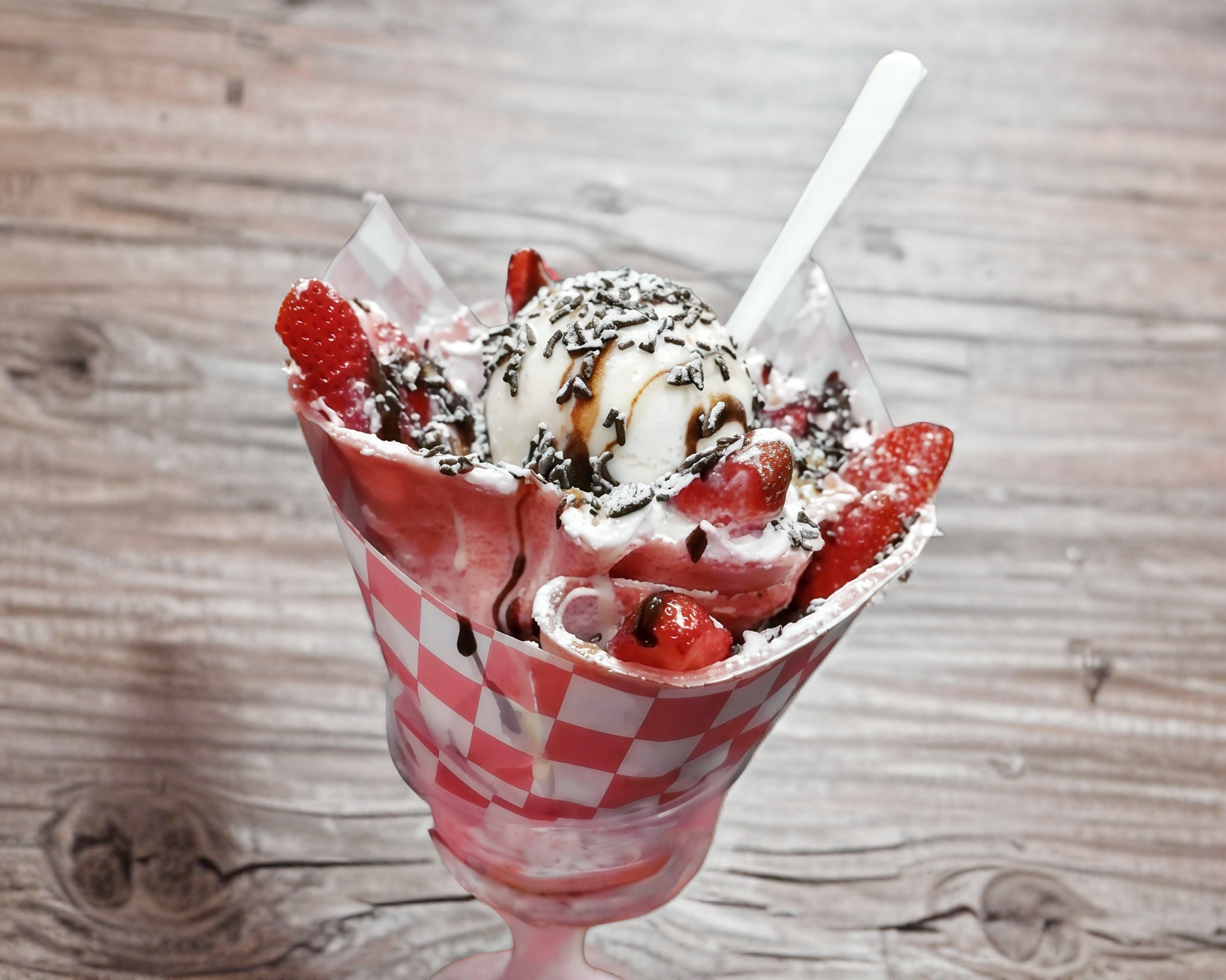 Una rica crepa dulce doblada como un burrito, rellena con 3 bolas de heladdo de vainilla y acompañada con 2 de tus ingredientes dulces favoritos.