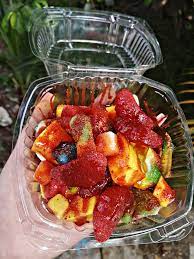 Frutas acompañadas de gomitas, chamoy, tajín, miguelito.