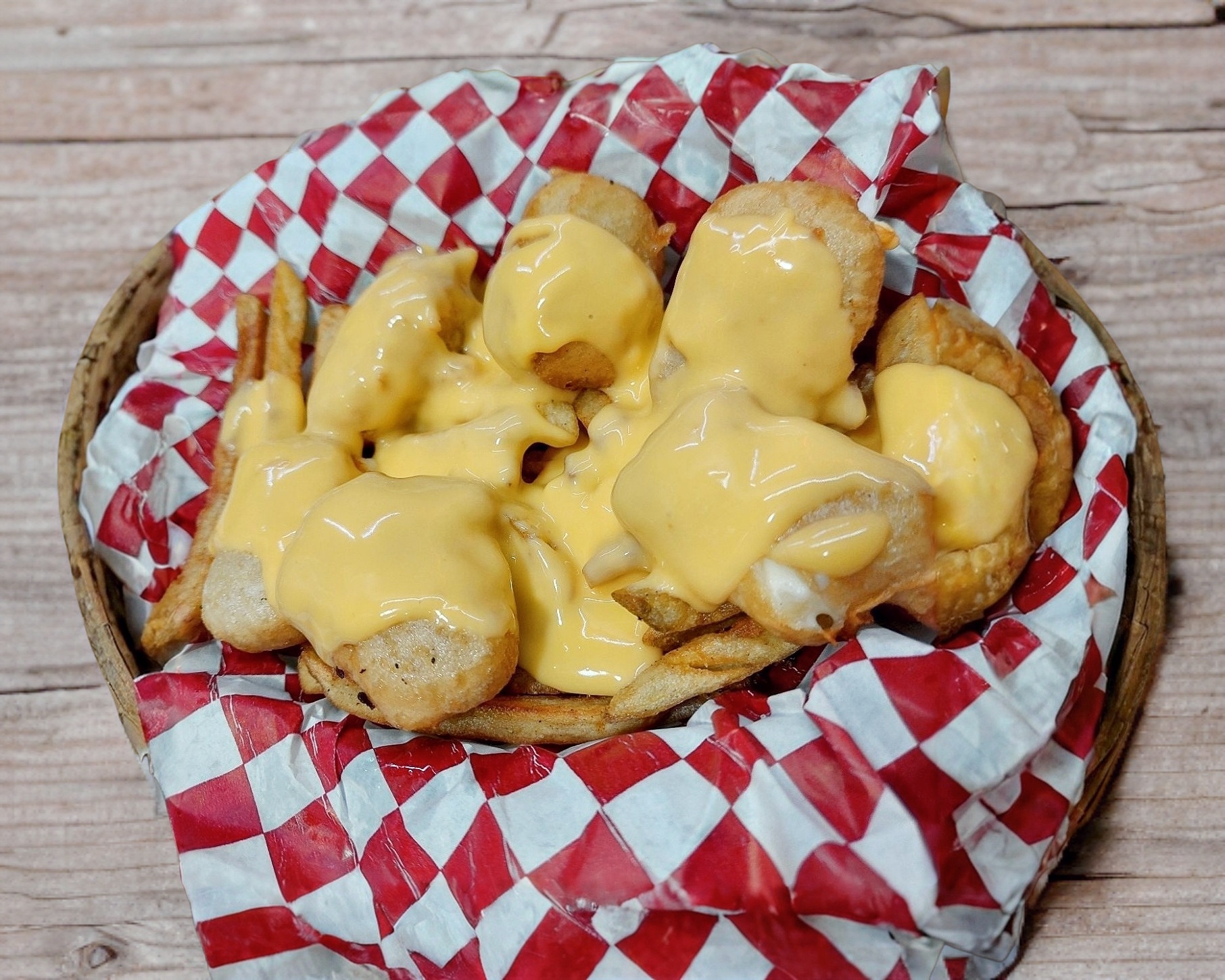 Ricas bolitas de queso manchego, fritas en tempura, acompañadas de papas a la francesa.