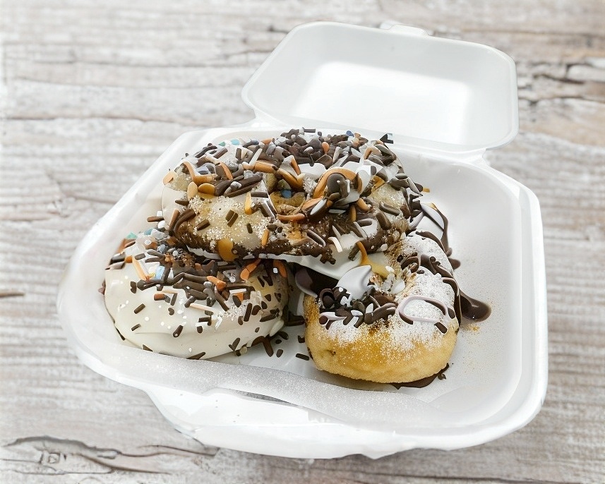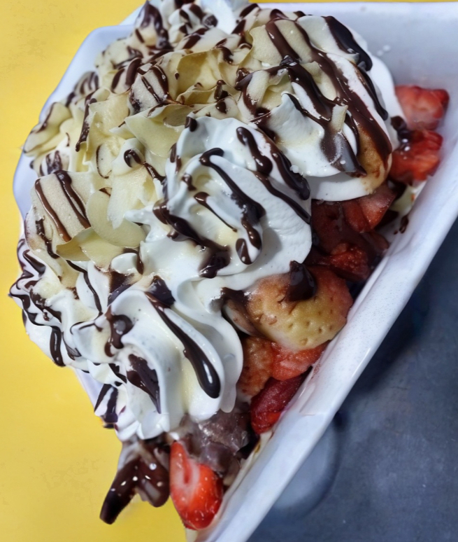 Un Pingüino frito en tempura, acompañado de 1 bolita de helado de vainilla con fresas y, o duraznos.