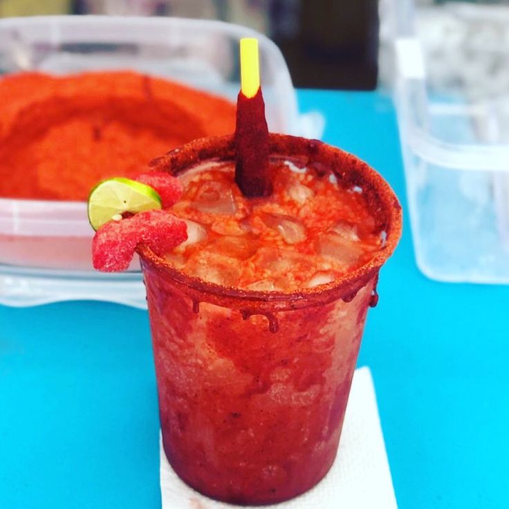 Escarchamos un vado de 1 L. con chamoy casero por dentro y por fuera, se pone tajín y miguelito, limón y sal, hielos y pulpa de fruta, para crear algo delicioso.