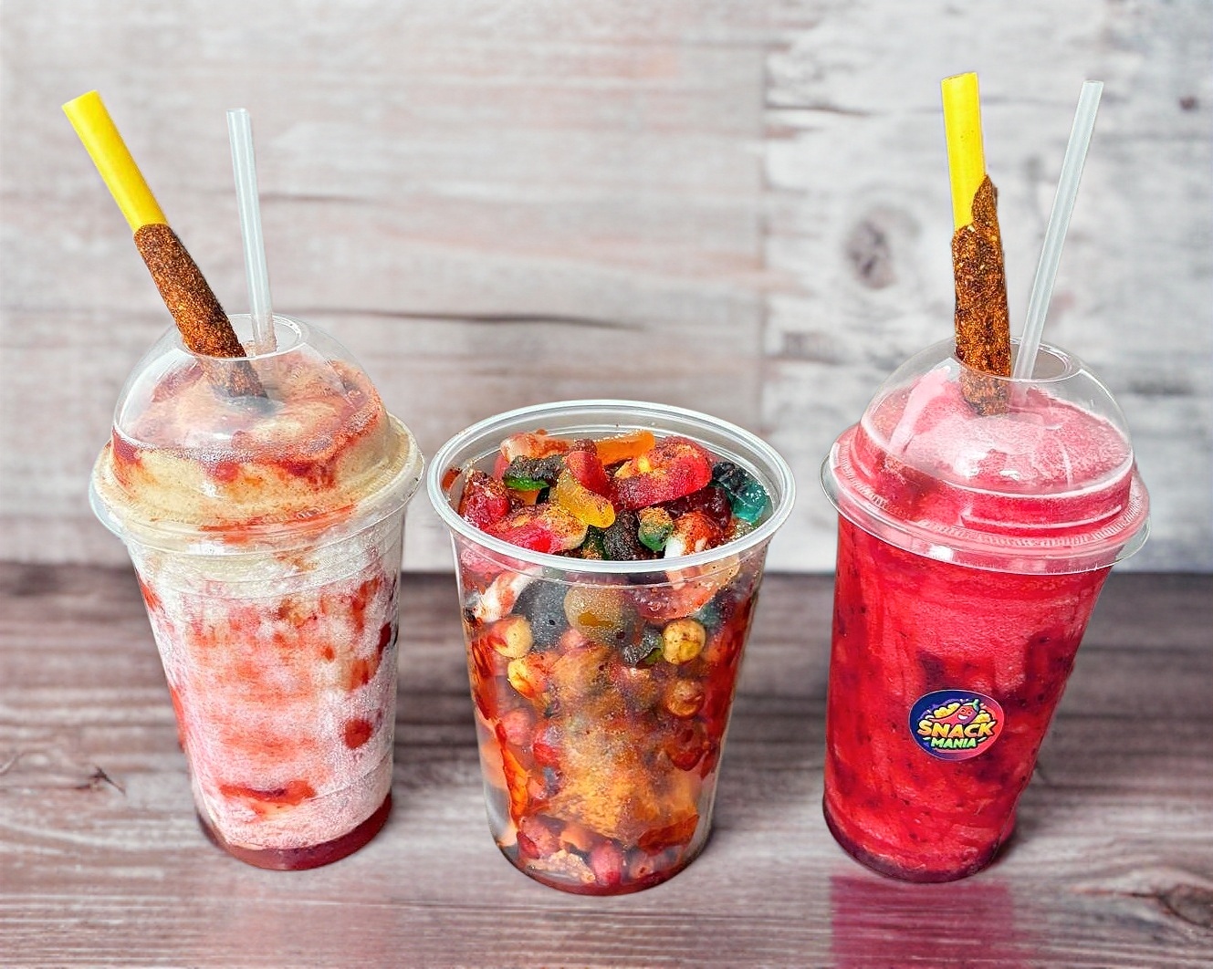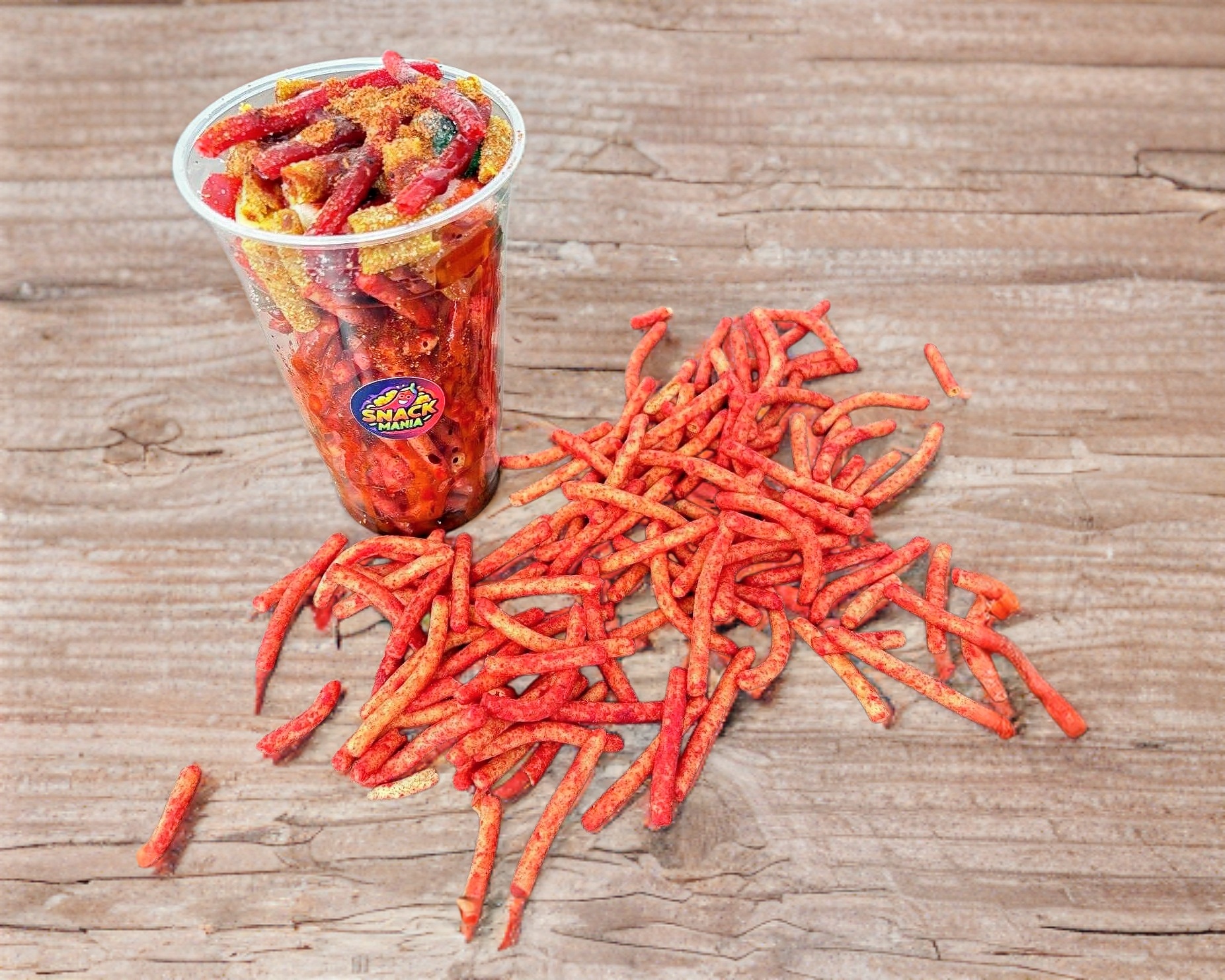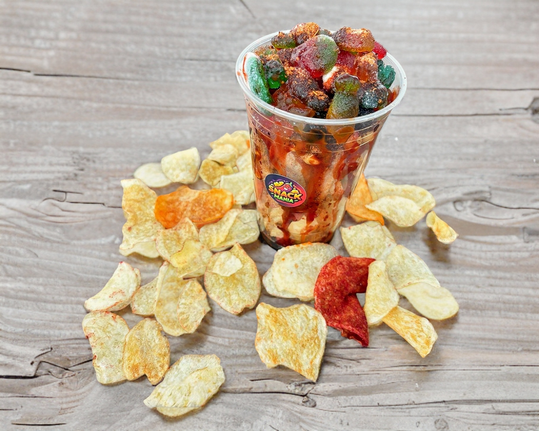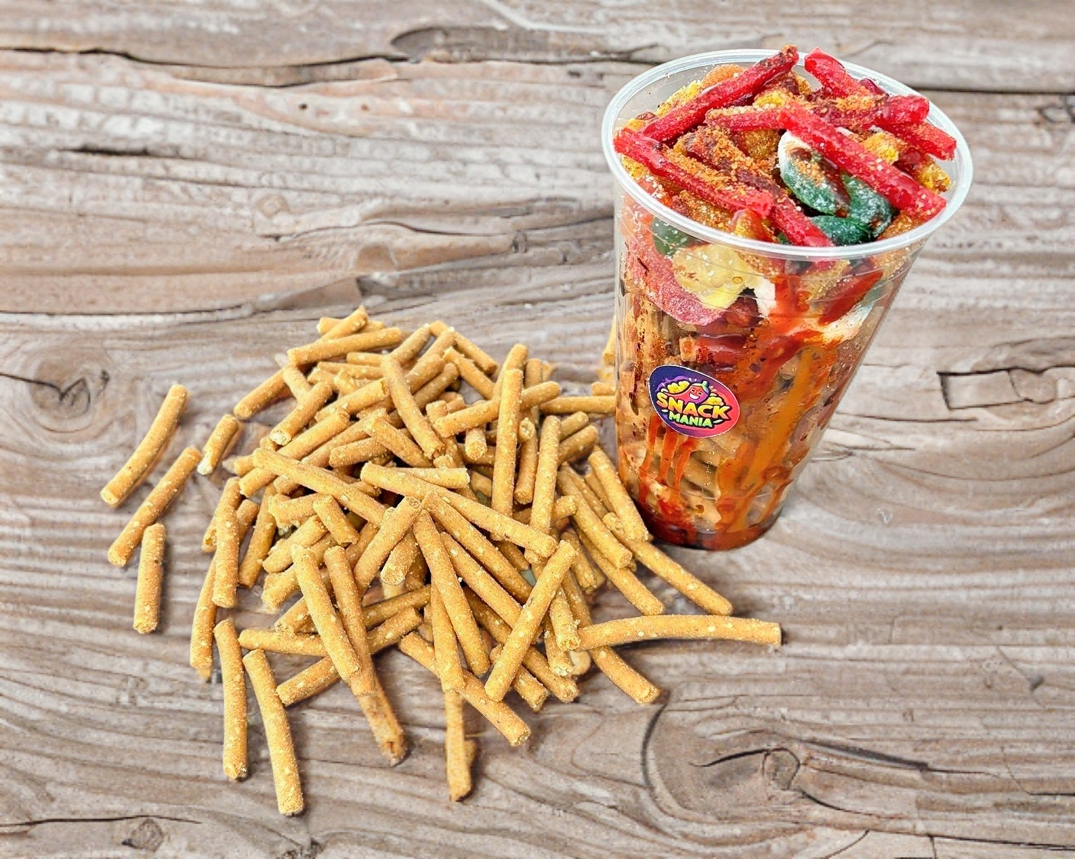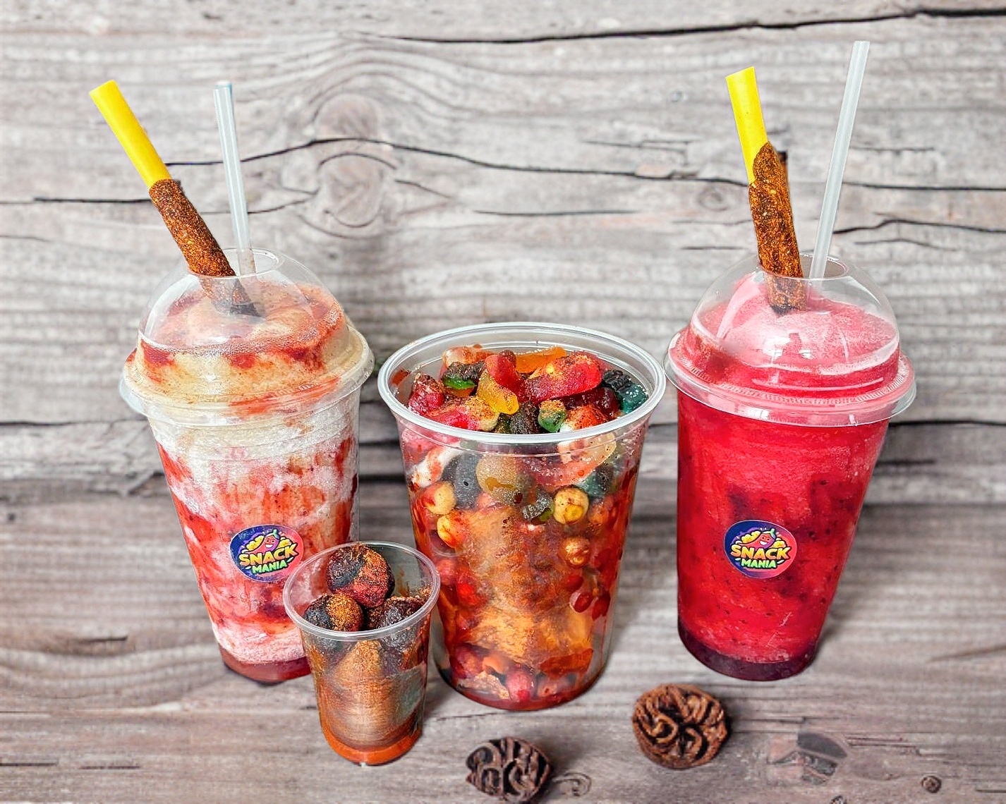 Churritos enchilados sumergidos 🌽 con salsas 🌶️, chilito en polvo 🔥 y muchas gomitas 🍬. ¡Prueba los toppings de mango enchilado 🥭🌶️!
