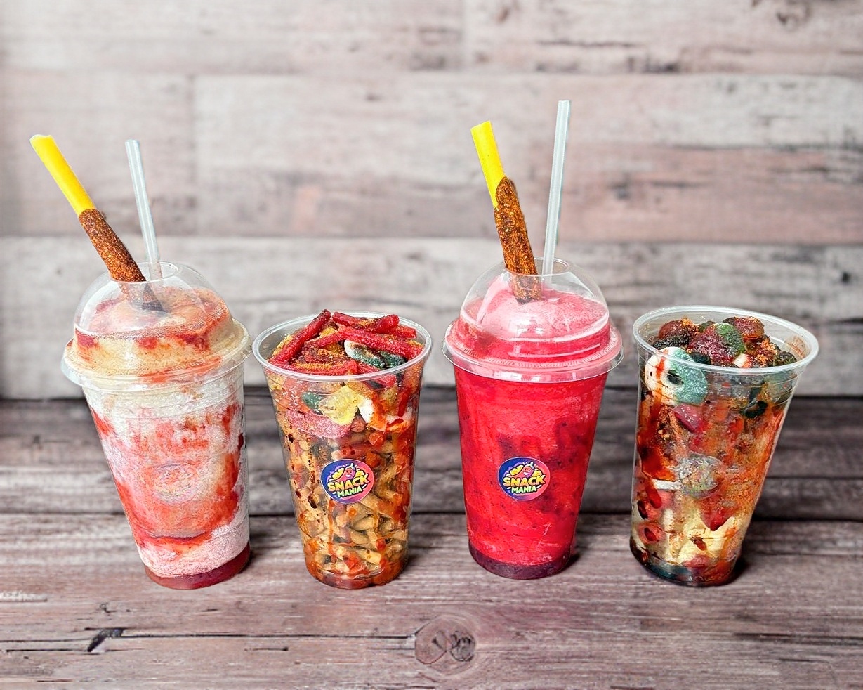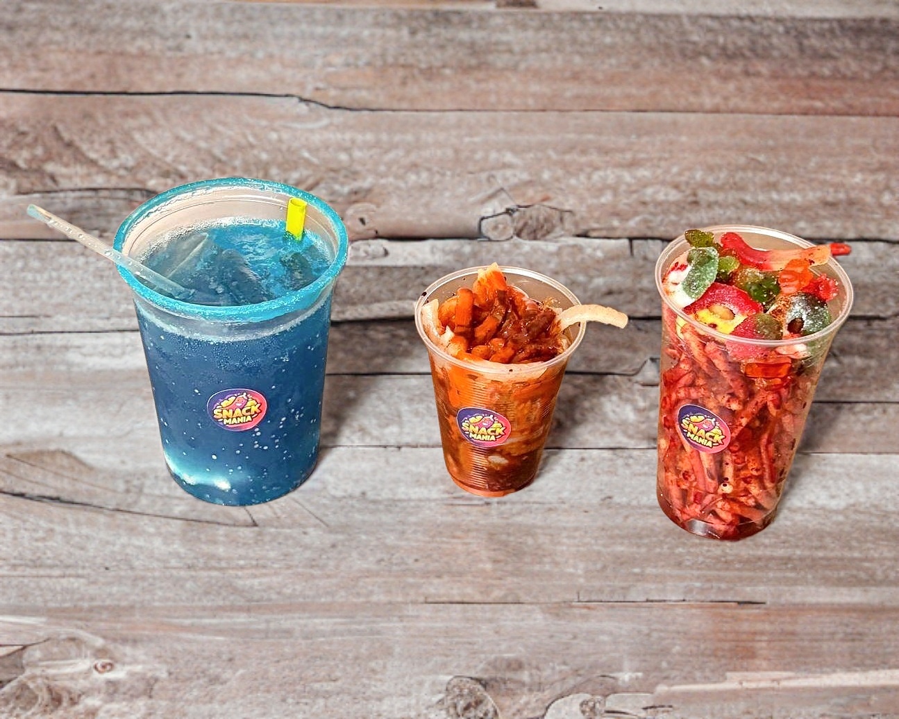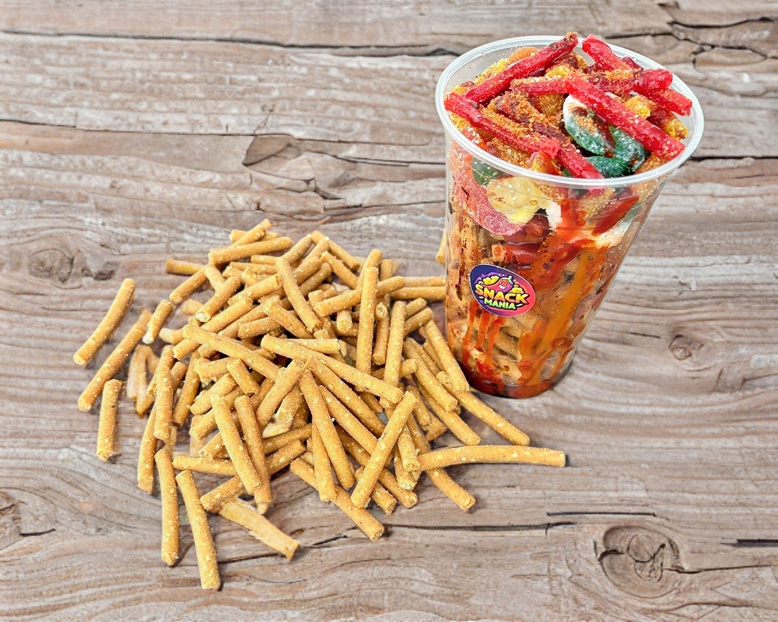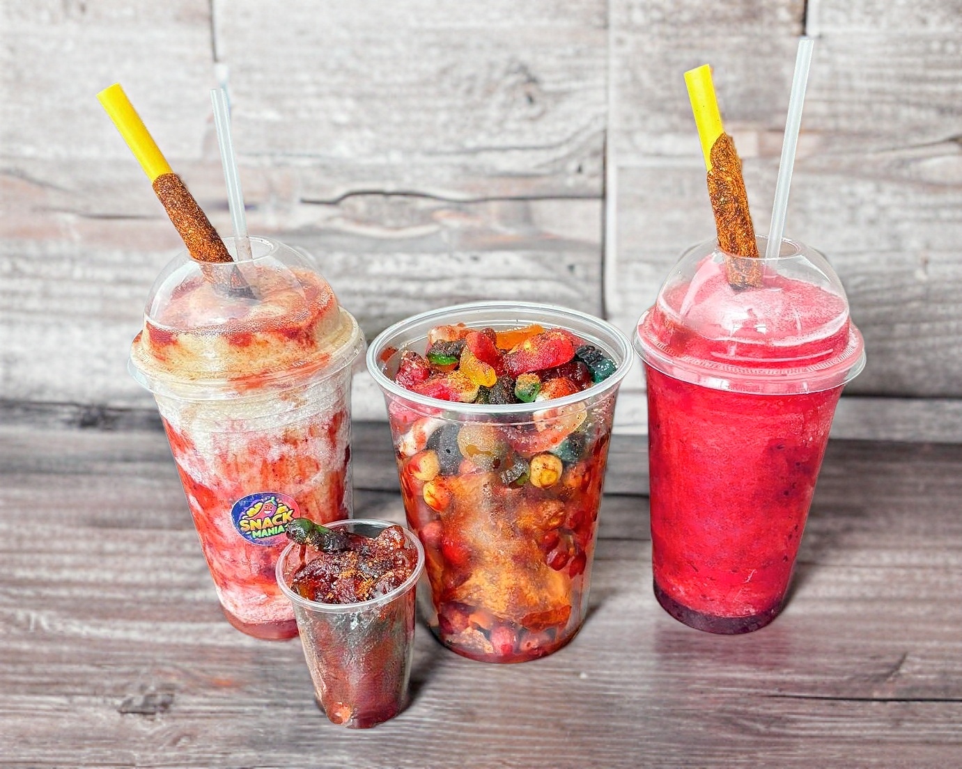 Churritos enchilados sumergidos 🌽 con salsas 🌶️, chilito en polvo 🔥 y muchas gomitas 🍬. ¡Prueba los toppings de mango enchilado 🥭🌶️!