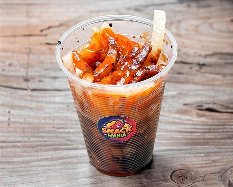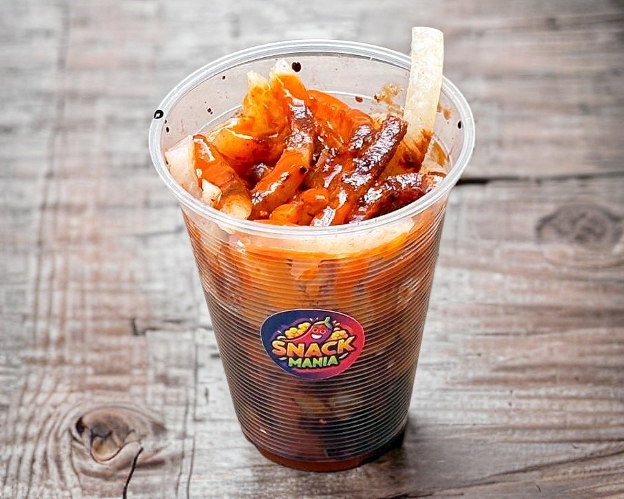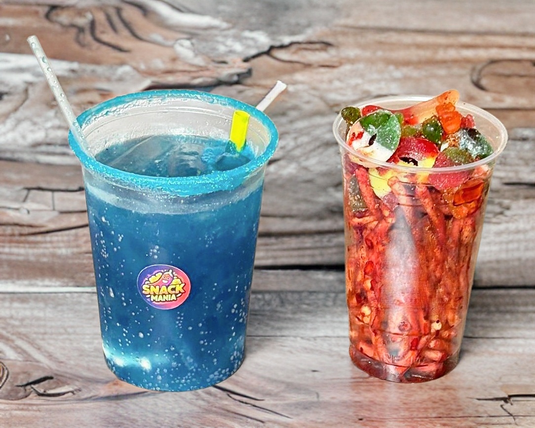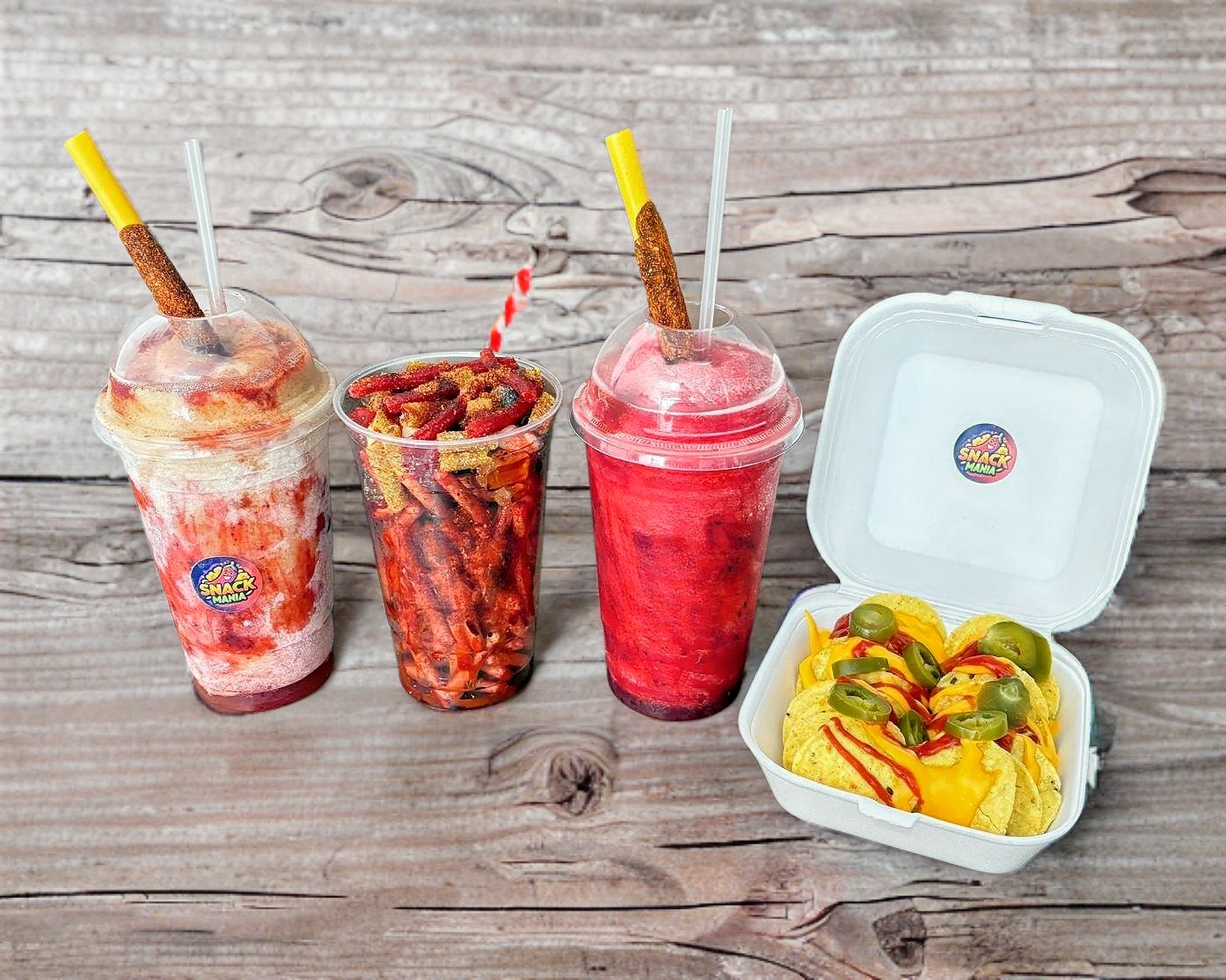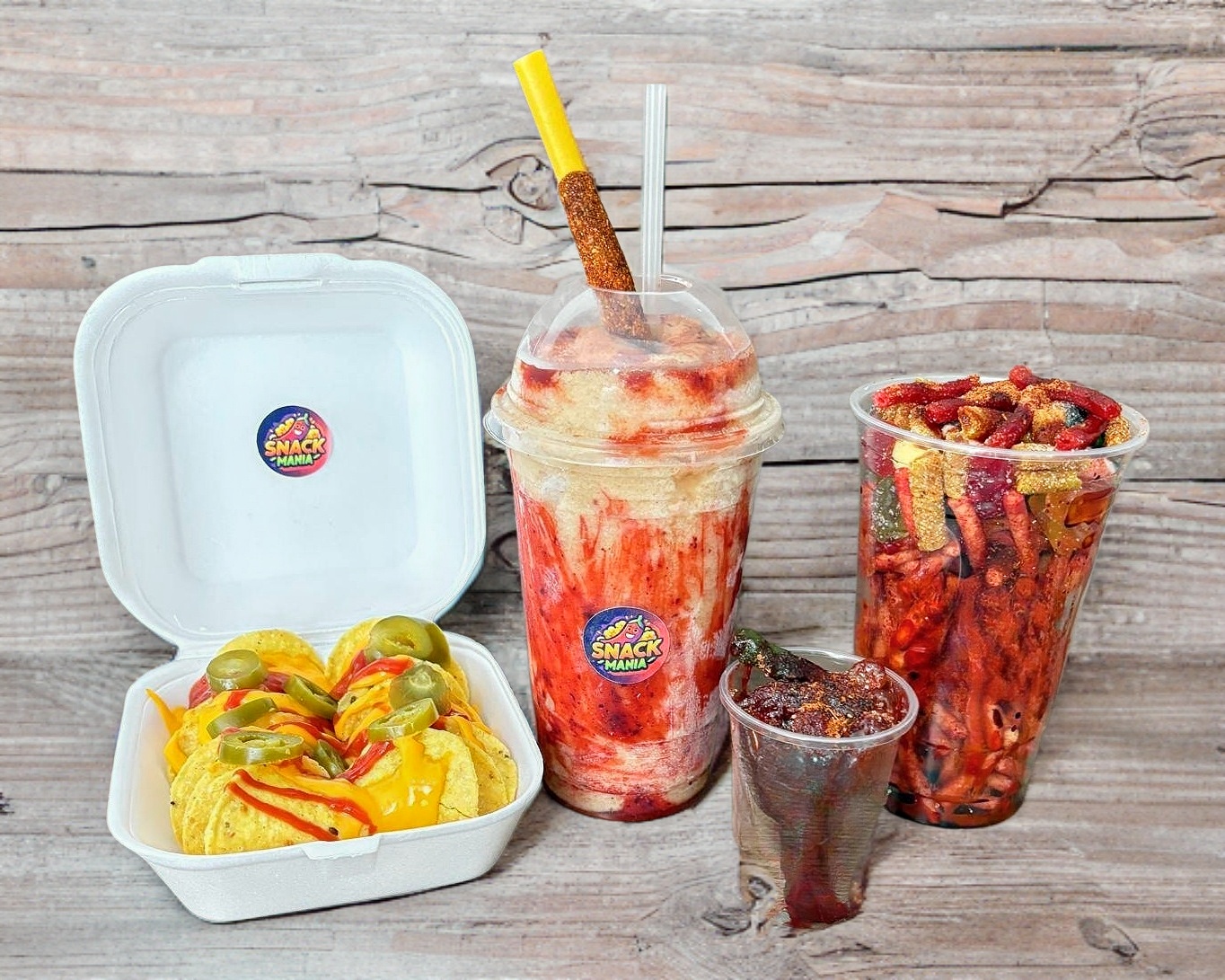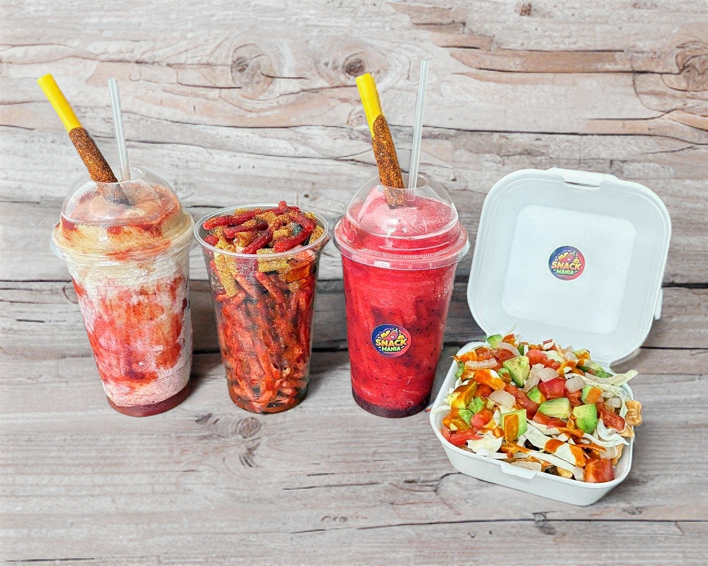 Churritos enchilados sumergidos 🌽 con salsas 🌶️, chilito en polvo 🔥 y muchas gomitas 🍬. ¡Prueba los toppings de mango enchilado 🥭🌶️!
