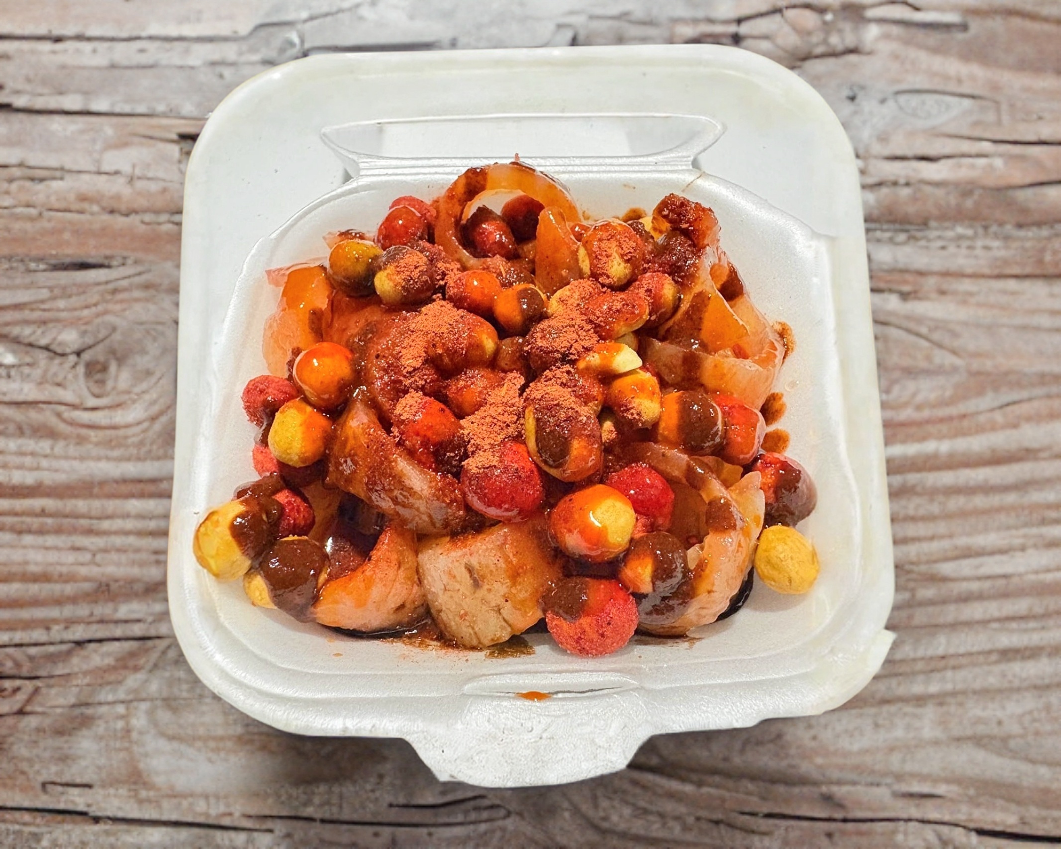Papas adobadas de hojuela con cacahuates, salsas, chilito en polvo y variedad de gomitas. ¡Un mix irresistible de sabores intensos! 🔥😋