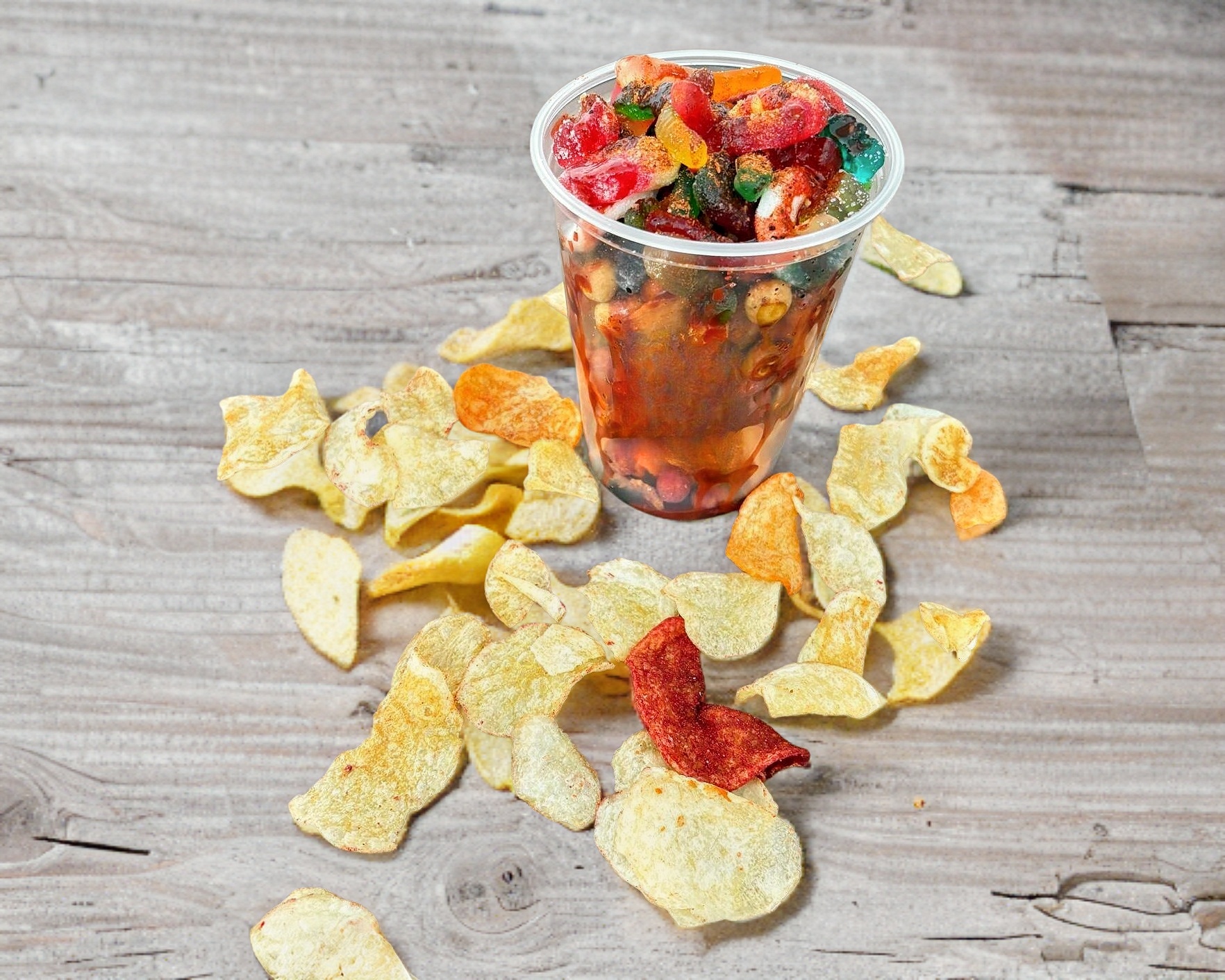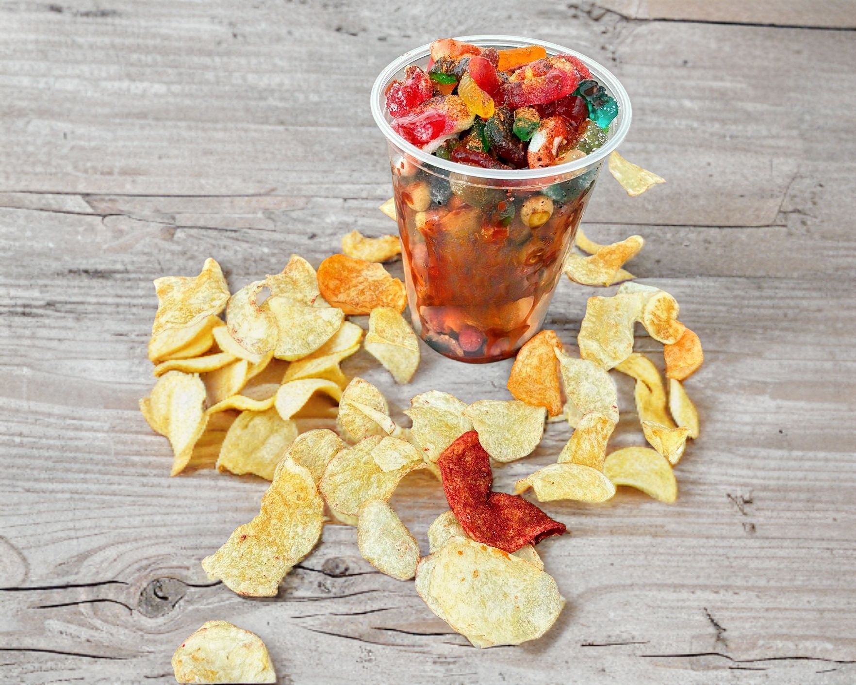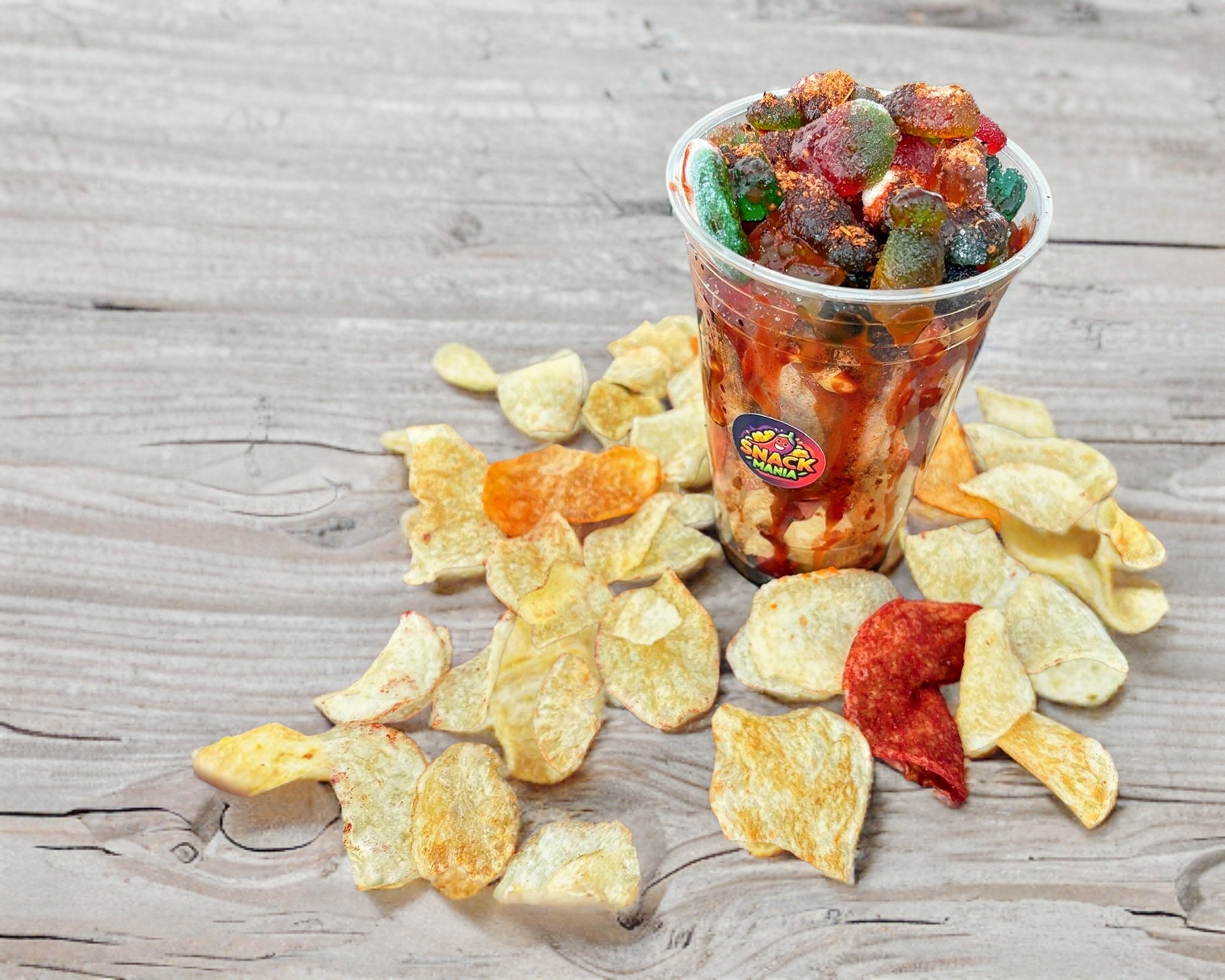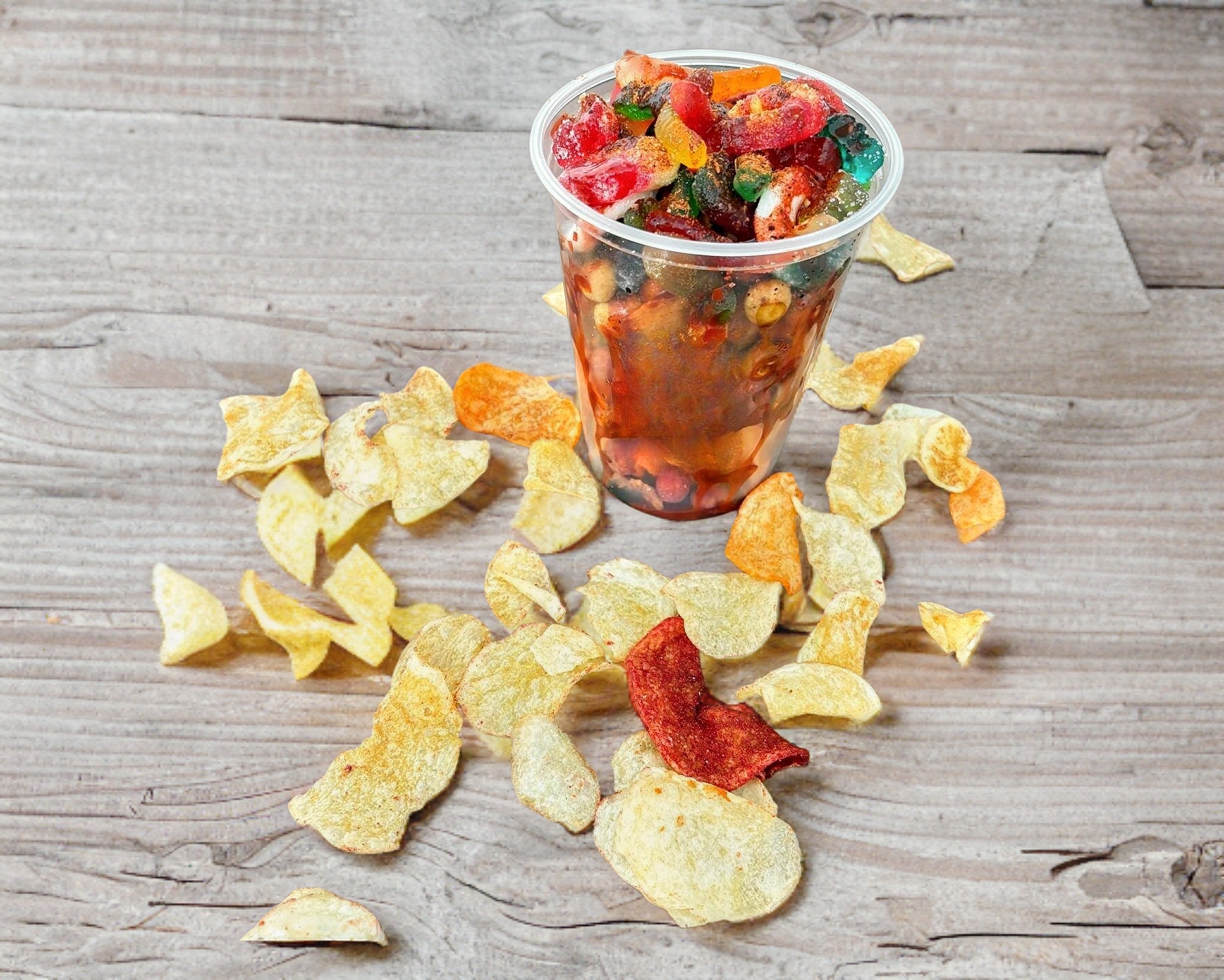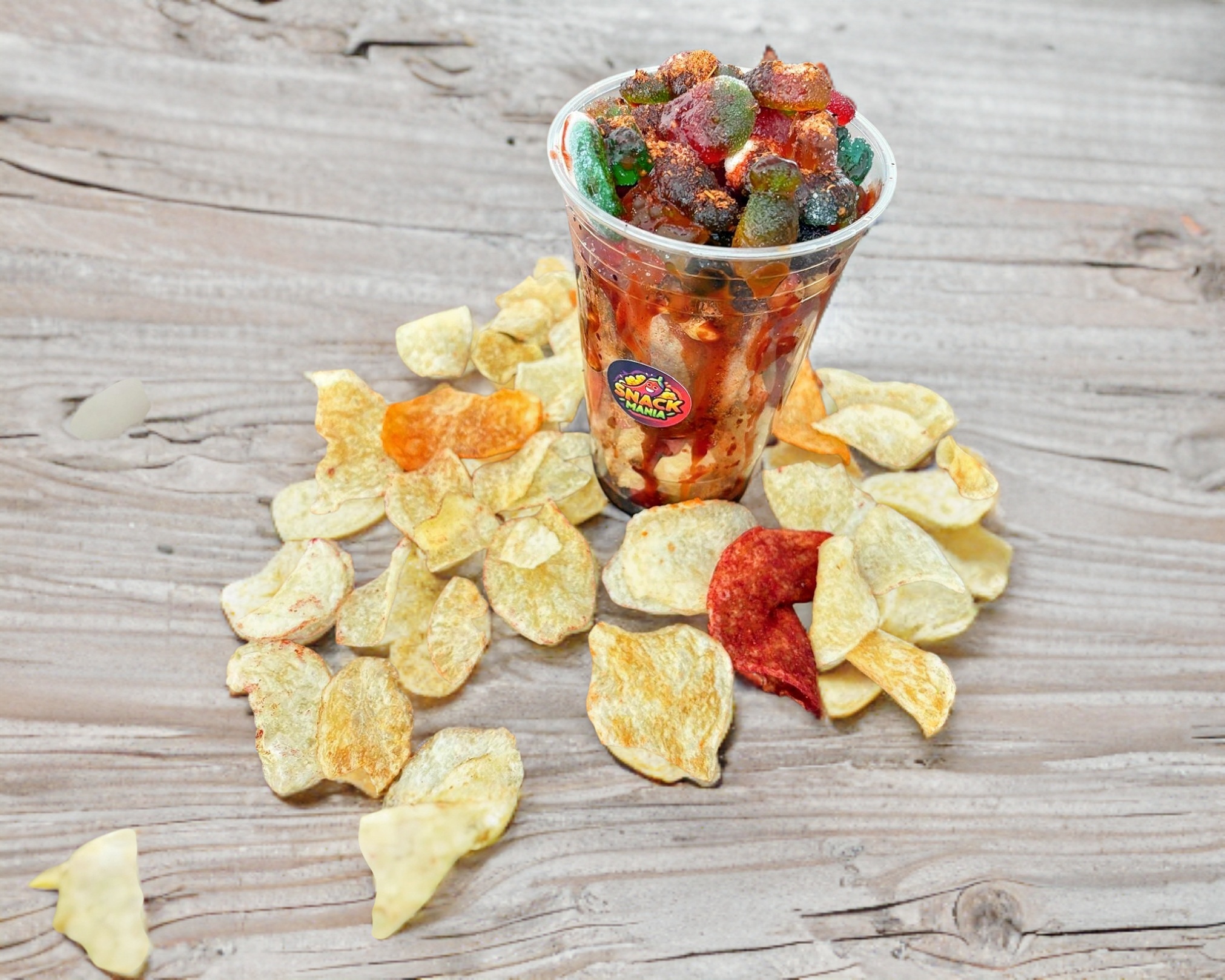 Papas de hojuela con cacahuates, salsas, chilito en polvo y una variedad de gomitas. ¡El mix perfecto de sabor y antojo! 🔥🥜🍬