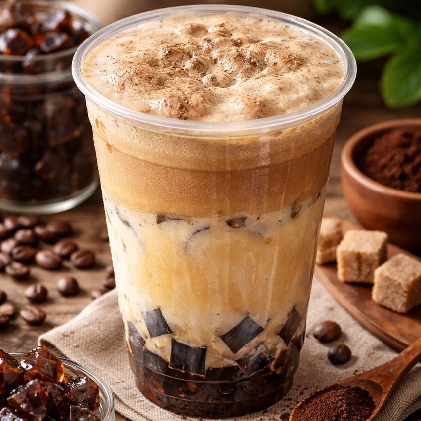Textura que enamora espuma cremosa mas cubitos de geoatina de cafe... simplemente otro nivel