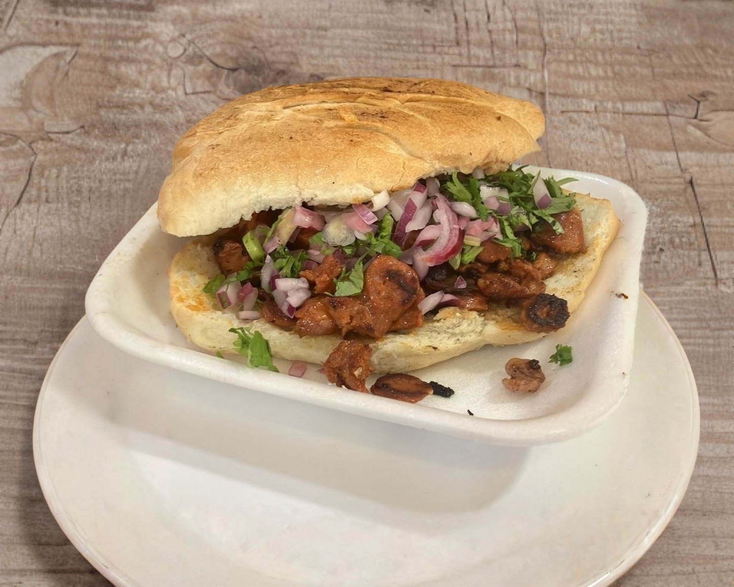 Viene con pan telera , carne pastor ,con (Cebolla ,cilantro ) piña aparte