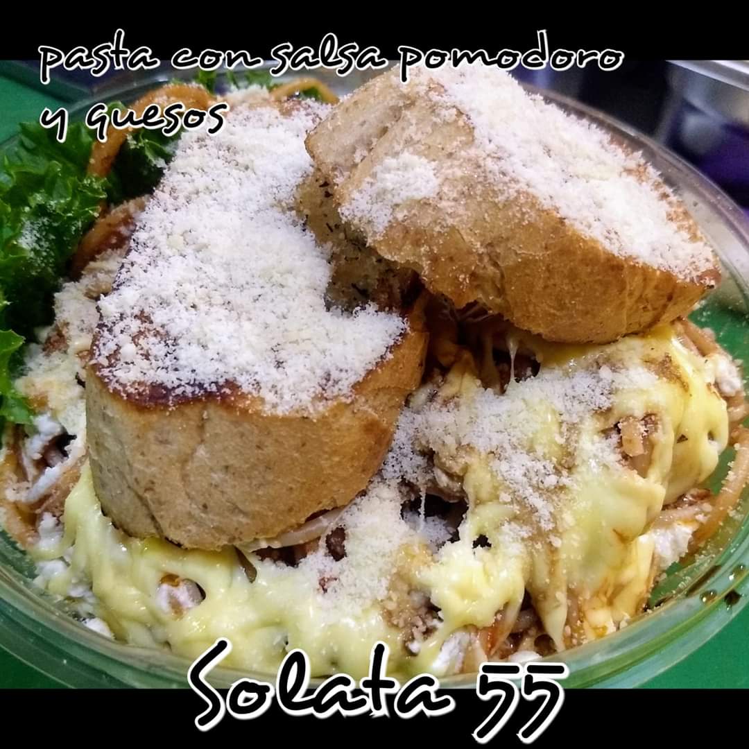 Pasta larga con salsa pomodoro, queso manchego, de cabra, acompañada de queso parmesano, aceite de oliva, viagre balsámico. Pan con un toque de hierbas. Agua del día 16 oz.