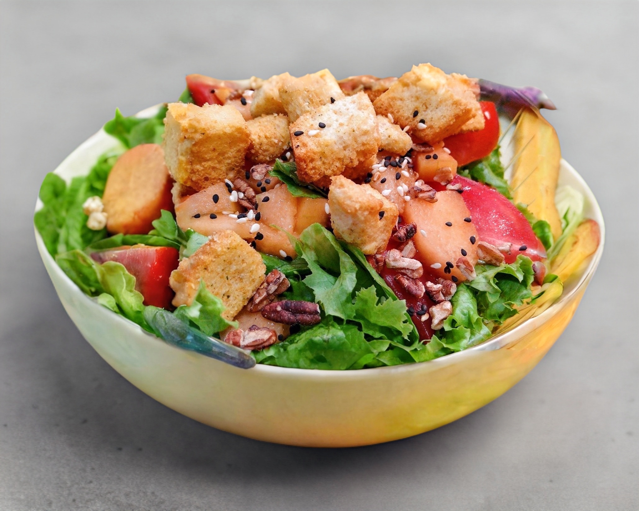 Lechuga Italiana, gajos de tomate, lamínas de melón, nuez pecana tostada. Toque de ajonjolí tostado, croutones, aderezo a elegir.