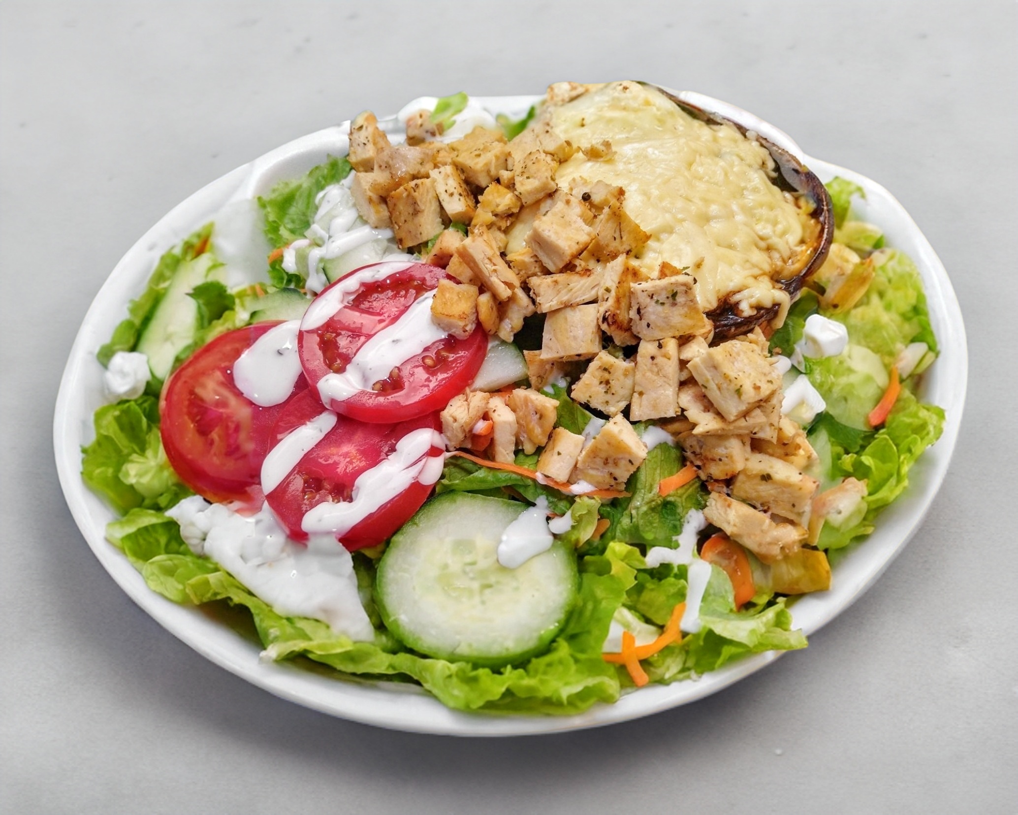 Portobello gratinado, acompañado de pollo a tu elección, sobre una cama de lechuga italiana, pepino, zanahoria, tomate, ad. ranch. Agua del día 16 oz.