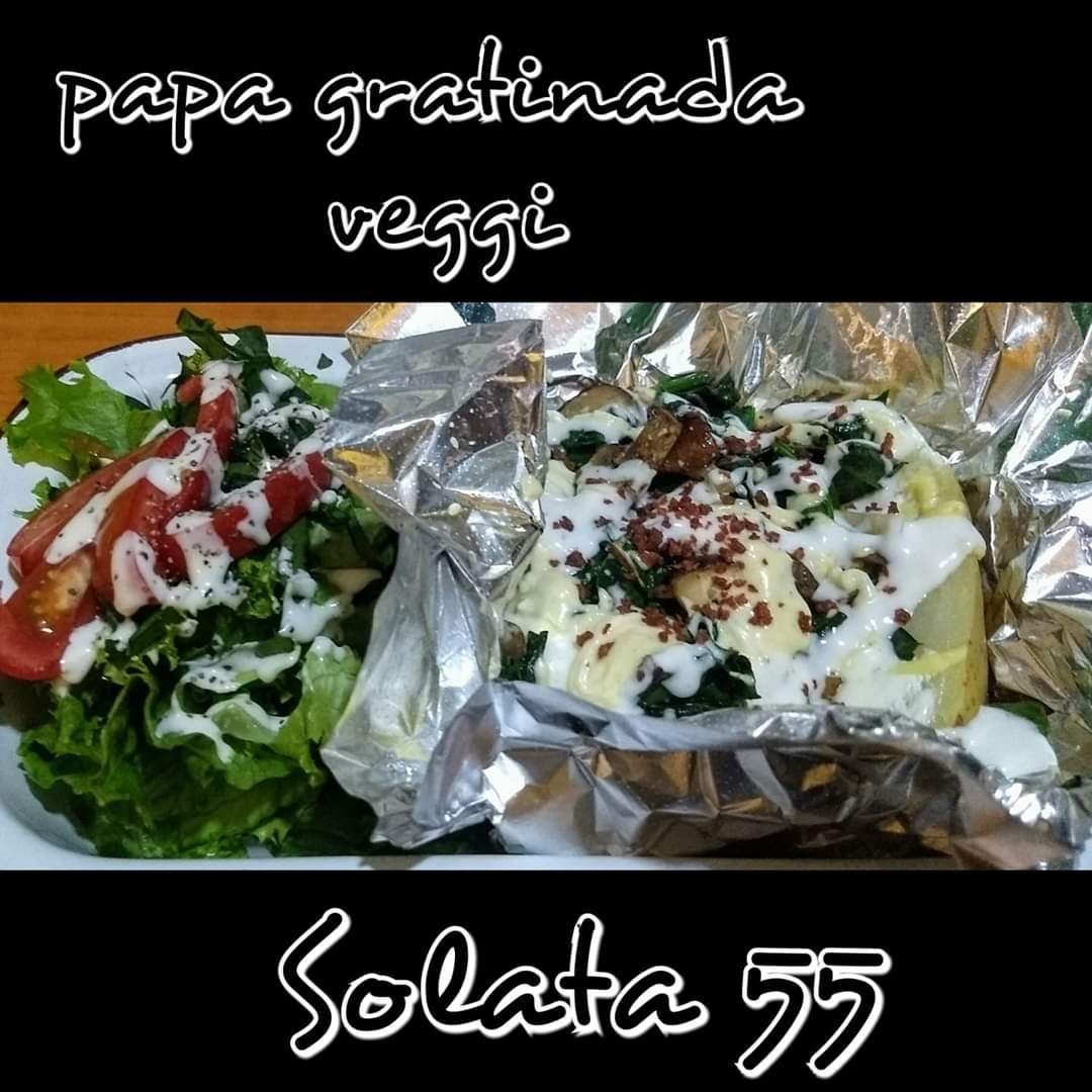 Papa con crema gratinada con queso manchego, mezcla de aderezos suaves, tocino deshidratado. Acompañada de lechuga italiana, espinaca, tomate, ad. ranch y pimienta. agua del día 16 oz.