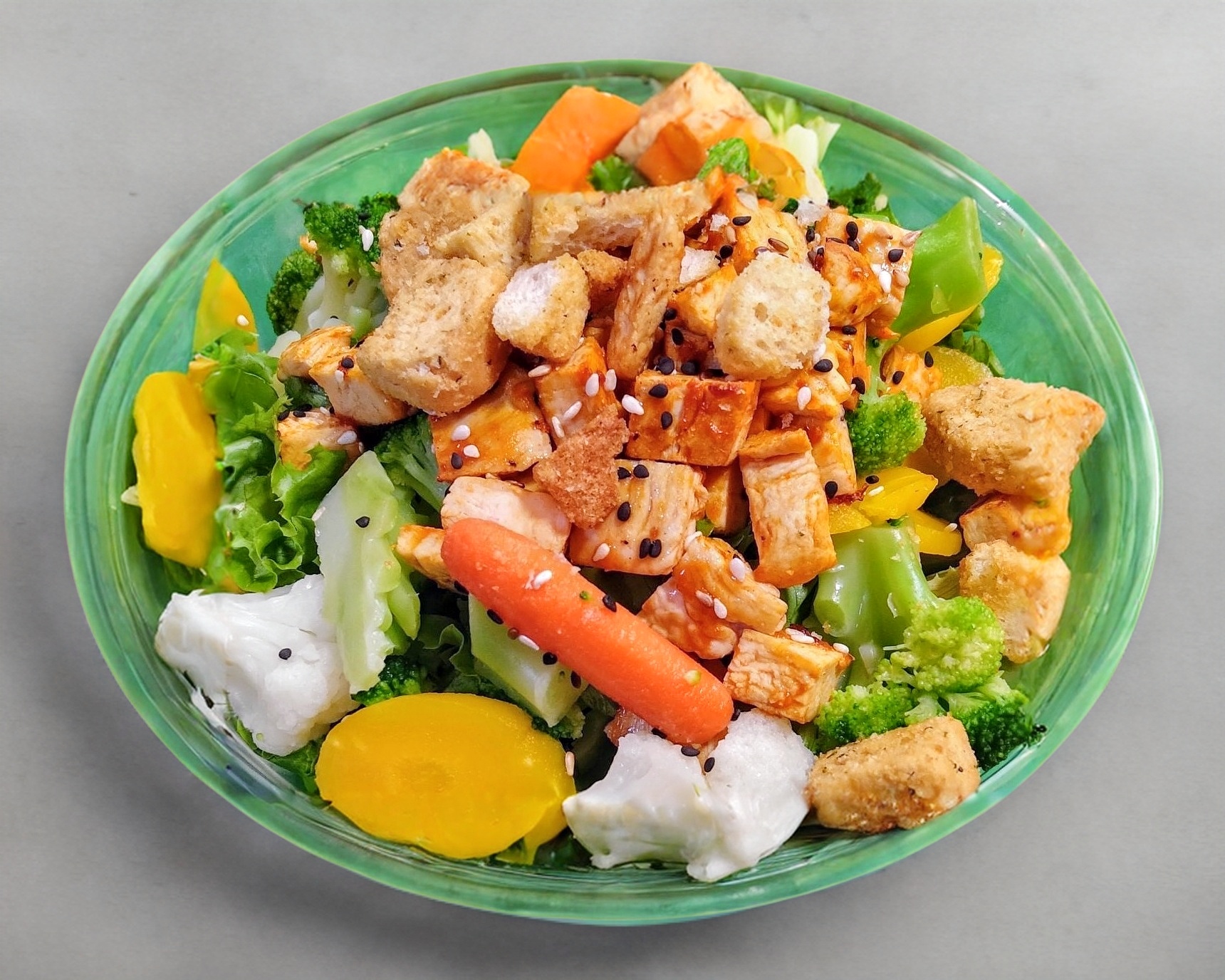 Lechuga Italiana, brocolí, coliflor, zanahoria baby, zanahoria amarilla. Toque de ajonjolí tostado, croutones, aderezo a elegir.