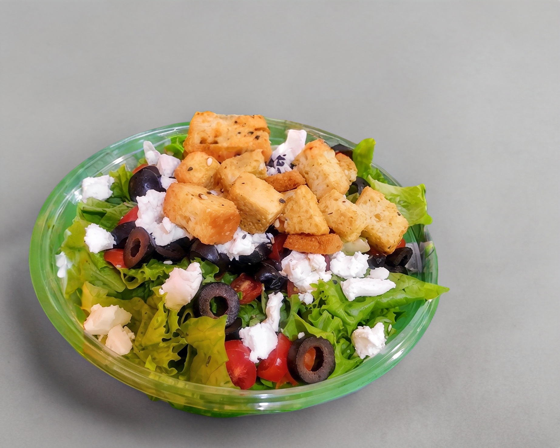 Lechuga Italiana, tomate uva, aceitunas negras, queso de cabra. Toque de ajonjolí, croutones, aderezo a elegir.