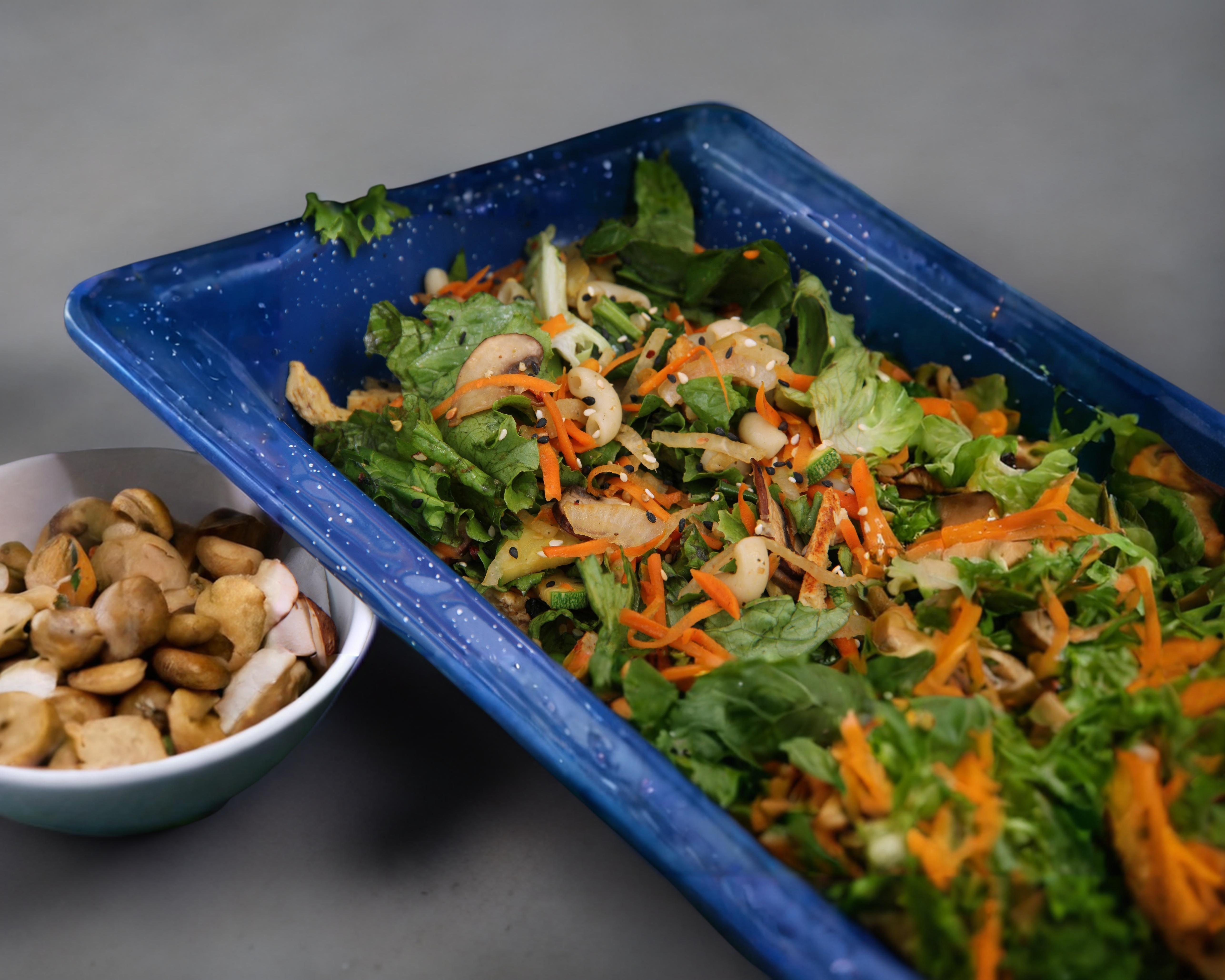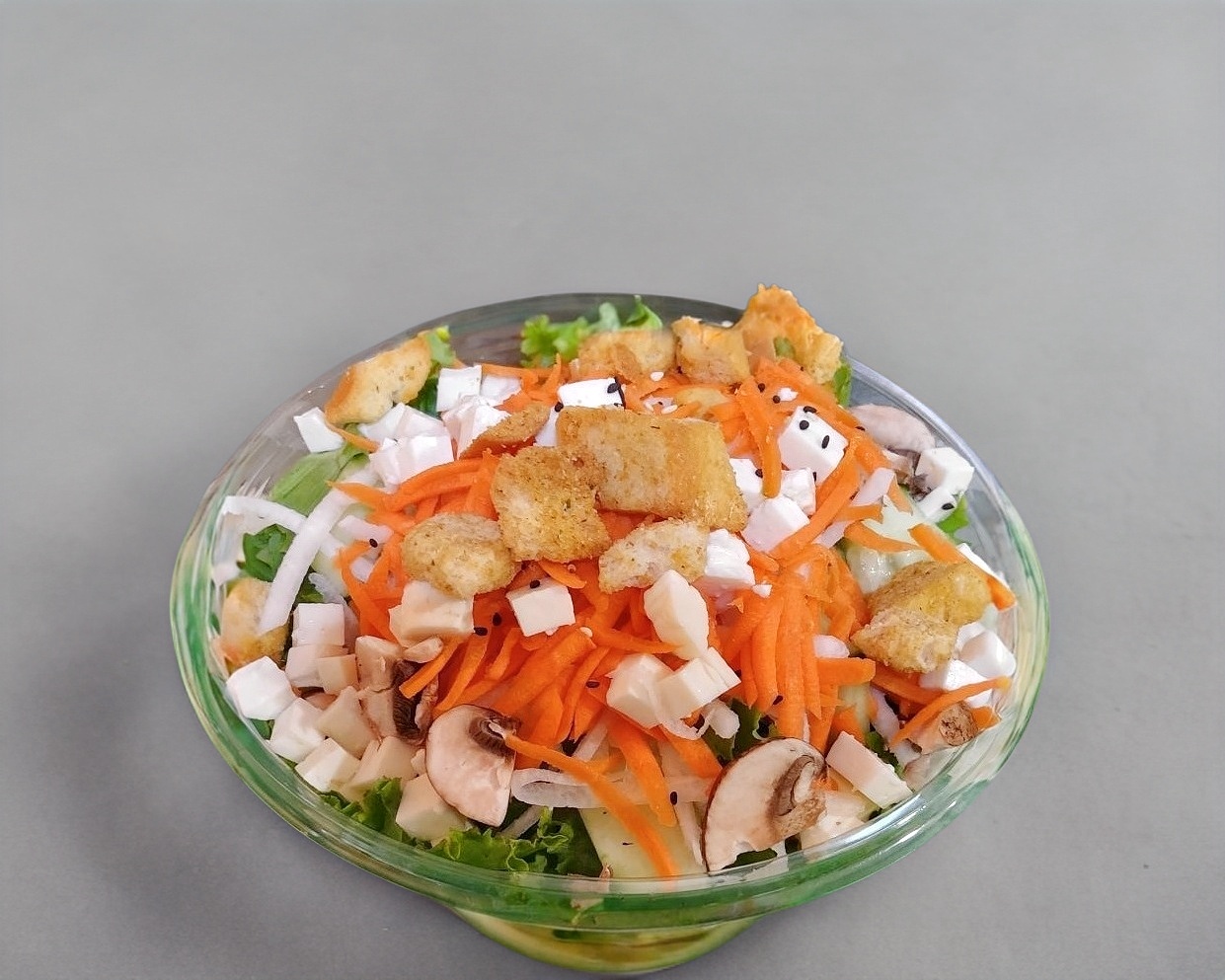 Lechuga Italiana, zanahoria, jícama, pepino, champiñones, queso panela. Toque de ajonjolí tostado, croutones, aderezo a elegir.