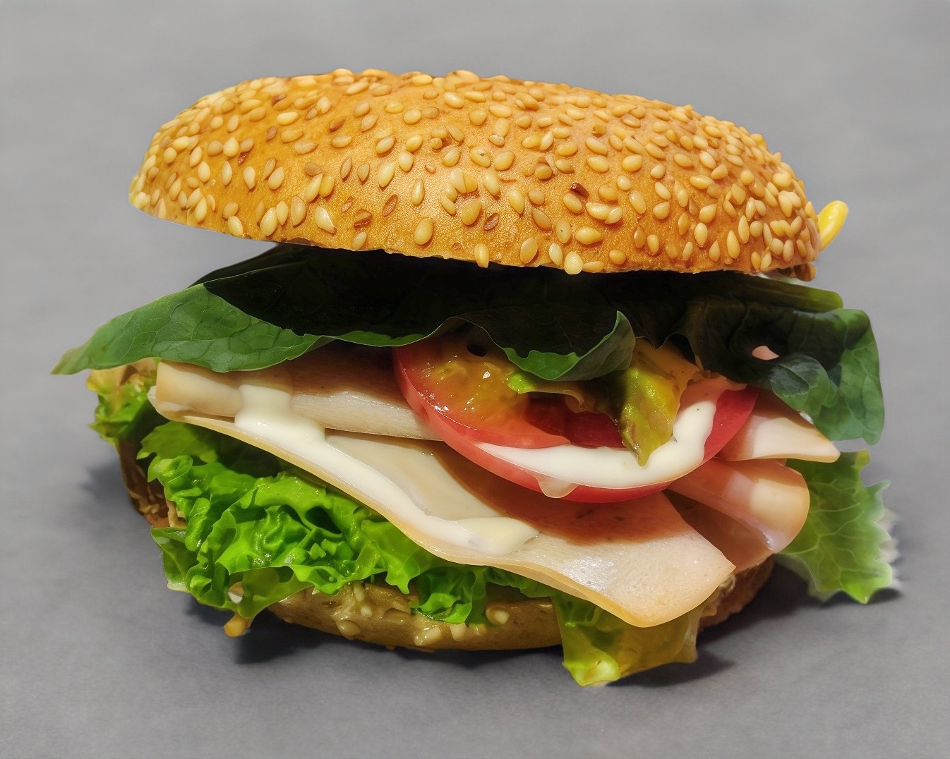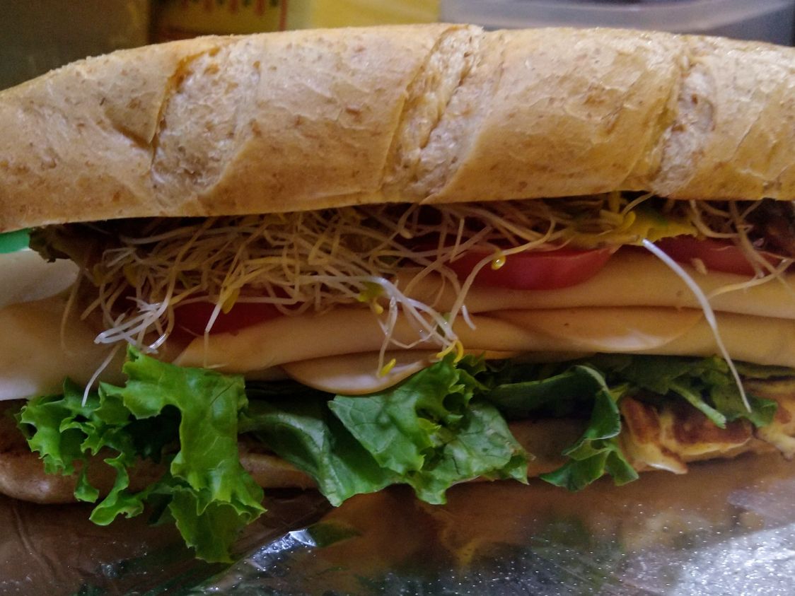 Lechuga Italiana, tomate, aguacate, germen de alfalfa, ad. mayo-moz., jamón o pavo, queso, to