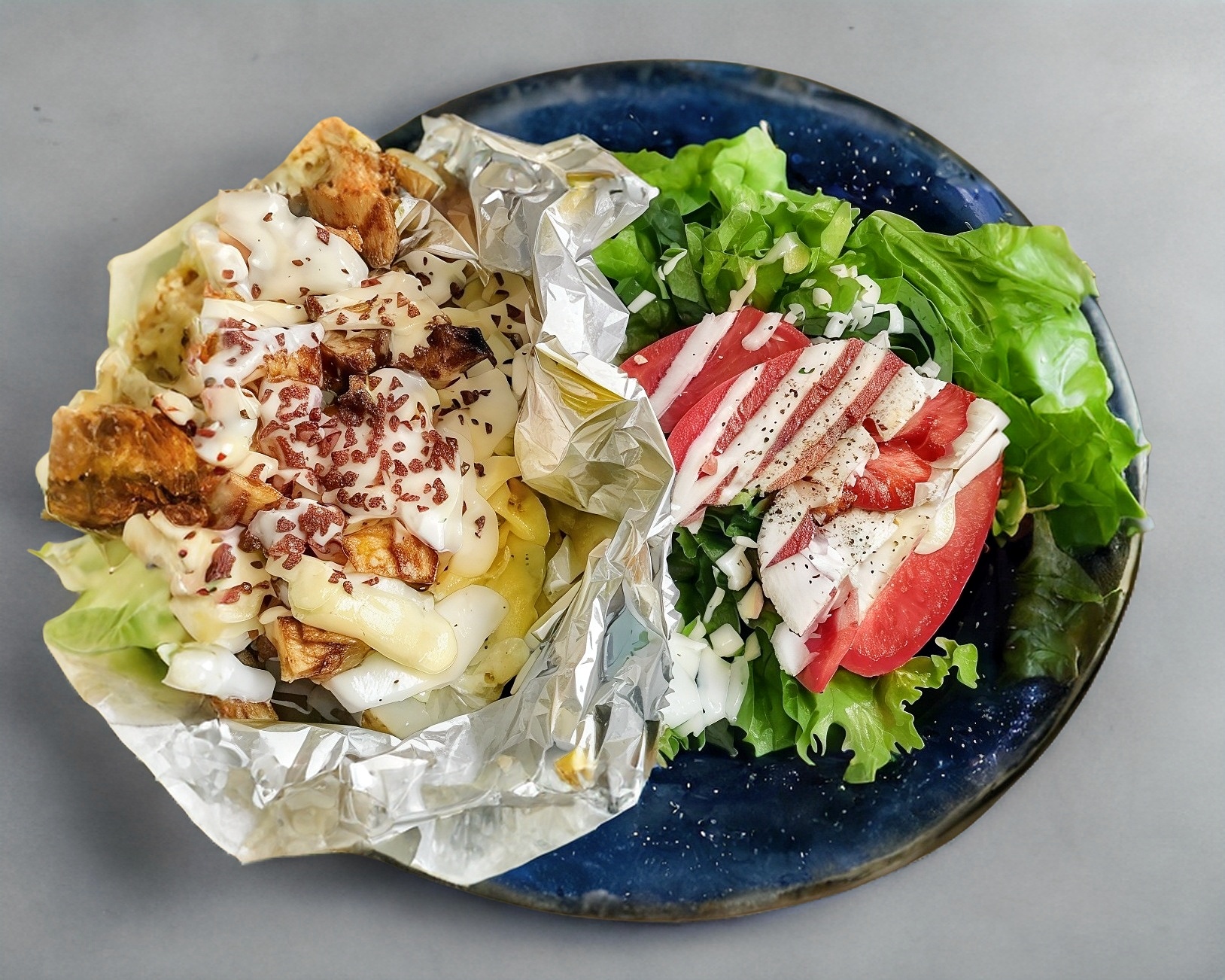Papa con crema gratinada con queso manchego, aderezos suaves, pollo a elegir, tocino deshidratado. Acompañada de lechuga italiana, espiaca, tomate, ad. ranch y pimienta. Agua del día 16 oz.