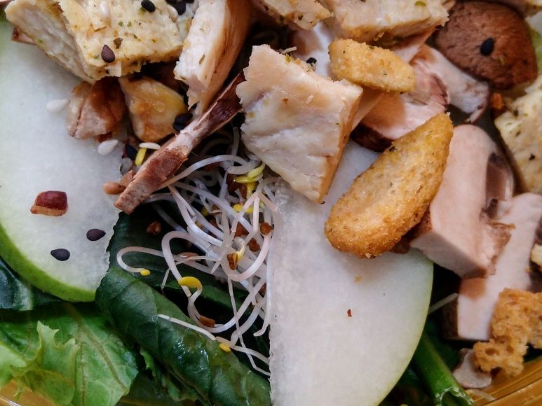 Lechuga Italiana, espinaca, germen de alfalfa, champiñones, nuez pecana tostada, láminas de pera. Toque de ajonjolí tostado, croutones y aderezo a elegir.