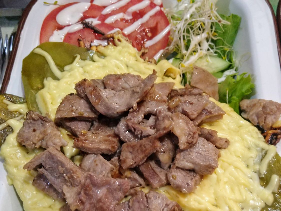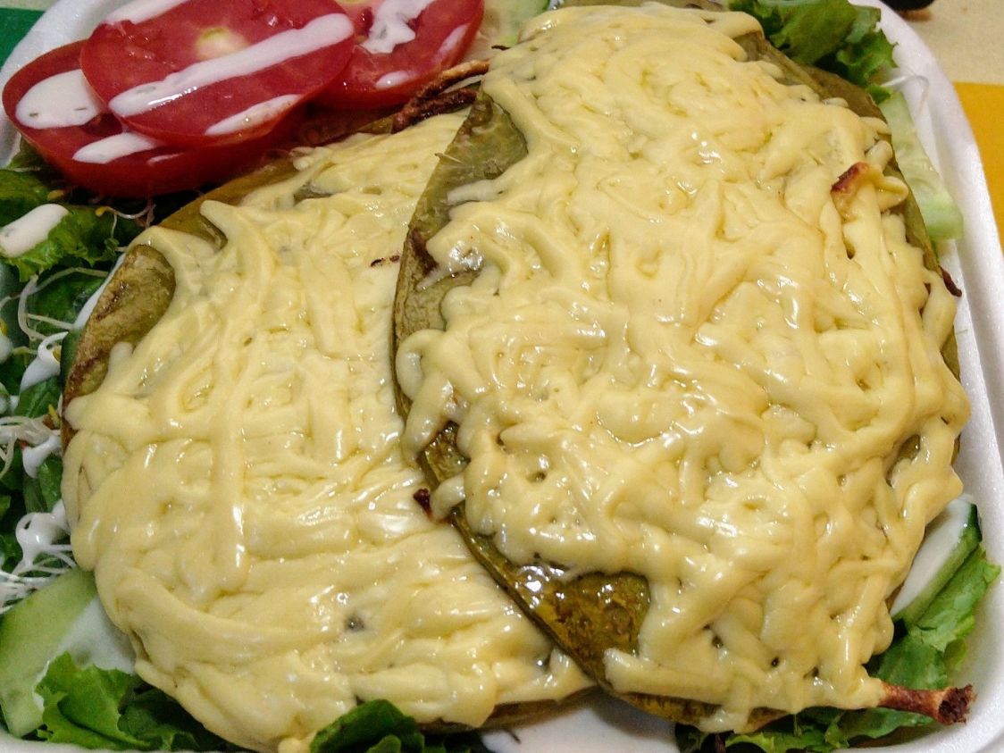 Nopal gratinado con queso manchego, acompañadp de pollo o costilla de res, sobre una cama de lechuga italiana, pepino, germen de alfalfa, tomate. Agua del día 16 oz.